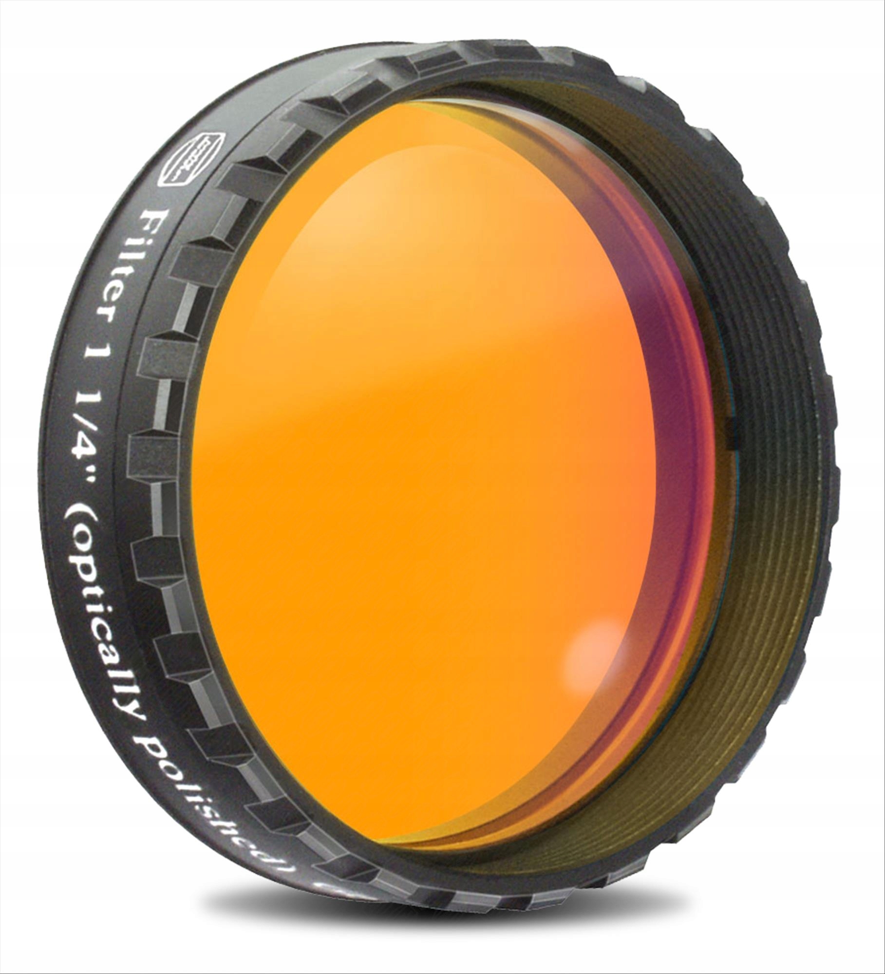 Оранжевый фильтр уменьшает синий и зеленый. Это явно укрепляет границы темных областей на марсианском щите. В случае Юпитера это улучшает видимость деталей в областях между экваториальными ремнями и в полярных областях. Это немного улучшает деталь изображений Сатурна, ремни планеты укрепляются, в частности голубые участки рядом с полюсами. Фильтр темнеет фон неба во время ежедневных наблюдений за планетами, поскольку большие телескопы улучшают видимость пылевой оплетки и головы кометы. Наблюдая за солнцем, оно используется, если вы хотите получить правильное воспроизведение цвета, когда мы используем солнечный фильтр из Mylar.