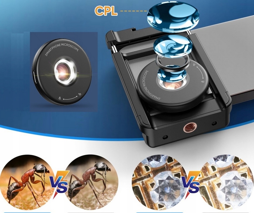 Просто поместите телефон в держатель. Затем с помощью резьбы 17 мм вкручиваем микроскоп, который должен быть правильно отцентрирован относительно объектива на телефоне, и все.