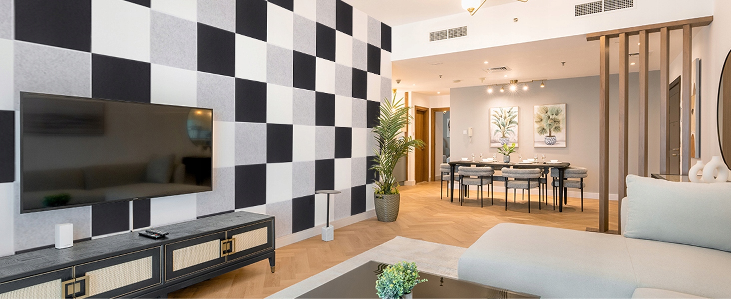- ✔ У вас есть звукопоглощающая стена из полиэфирных волокон с высокой плотностью, использует принцип звуковой поглощения для улучшения акустики помещения.