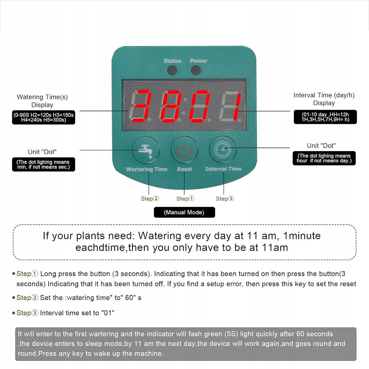 Интуитивное управление: в отличие от традиционных систем капельного орошения, вы можете свободно регулировать временной режим в определенном диапазоне. Время полива варьируется от 1 секунды до 5 минут, а интервалы полива — от 12 часов до 10 дней. Идеальное сочетание свободно выбираемого времени и частоты полива позволяет легко удовлетворить потребности ваших растений.