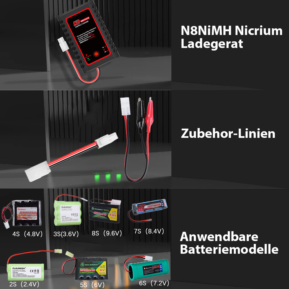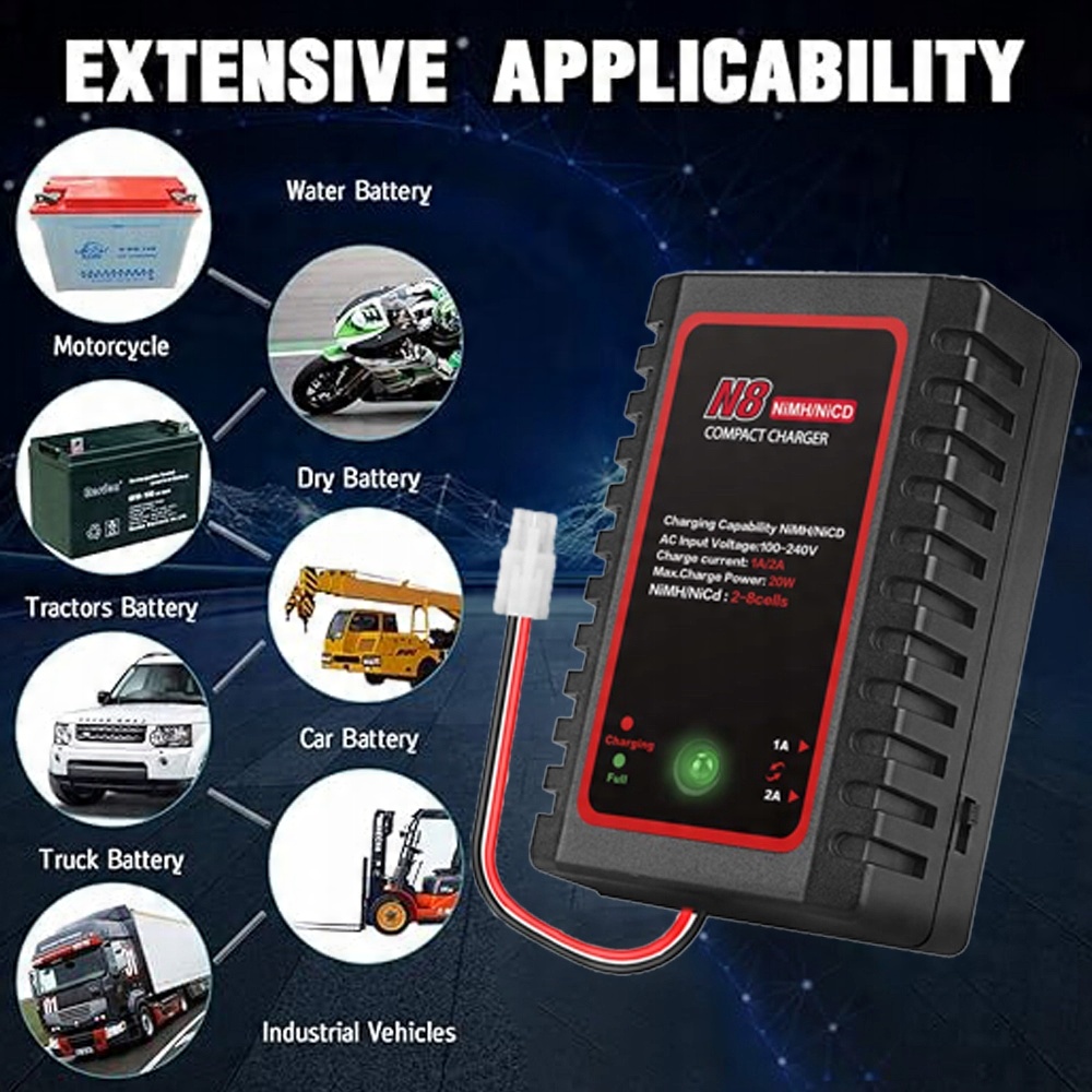 【Интеллектуальное зарядное устройство NIMH】 Это зарядное устройство N8 NIMH было специально разработано для батарей NIMH/NICD с напряжением 2-8 с (2,4-9,6 В) для беспилотников/удаленных автомобилей/удаленных лодок/лодок. Интеллектуальная зарядка с функцией перезагрузки, безопасная и эффективная. h1> 【Вход и выход】 Входное напряжение AC: 100-240 V. Выходная мощность: 20 Вт, ток зарядки: 1a/ 2a. В зависимости от емкости аккумулятора, ток зарядки может быть установлен на 1a или 2a, используя переключатель, расположенный на стороне зарядного устройства. h1> просто подключите шнур питания, зарядное устройство и батарею. Устройство компактно и элегантно, легко переносить и подходит для путешествий. h1> 【два -сортируемый индикаторный свет】 Красный свет всегда светит, когда зарядка ожидается, зеленый свет всегда светит при завершении зарядки, а красный и зеленый свет вспыхивает, когда аккумулятор не подключен. NIMH/NICD Батареи со стандартным разъемом Tamiya или Mini Tamiya Connector. Клипы крокодила могут использоваться в проектах «Сделай сам». Mini Tamiya Connector имеет круглый положительный (красный провод) и квадратный отрицательный кабель (черный проволоки). Убедитесь, что кто -то несет ответственность за зарядку батареи. h1>