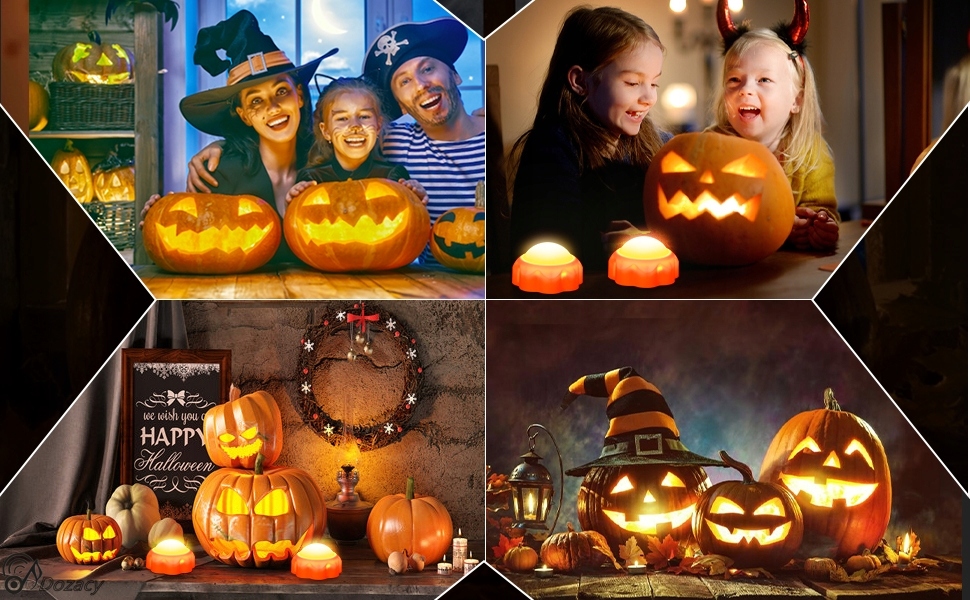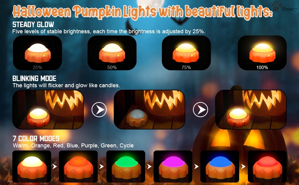 Эти тыквенные светильники размером 2,67 дюйма в диаметре и 1,57 дюйма в высоту подходят для размещения внутри тыкв различных размеров в качестве источника света. В то же время они могут излучать теплый свет достаточной яркости, чтобы создать атмосферу вечера Хэллоуина.