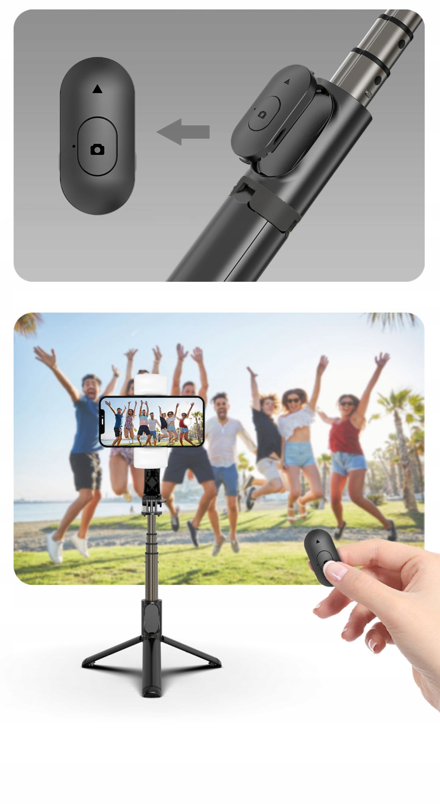 ✅ Bluetooth -пульт дистанционного управления с диапазоном до 10 метров позволяет вам удобно делать фотографии и записи, не касаясь телефона. Это идеальное решение для записи независимости, презентаций или групповых фотографий.