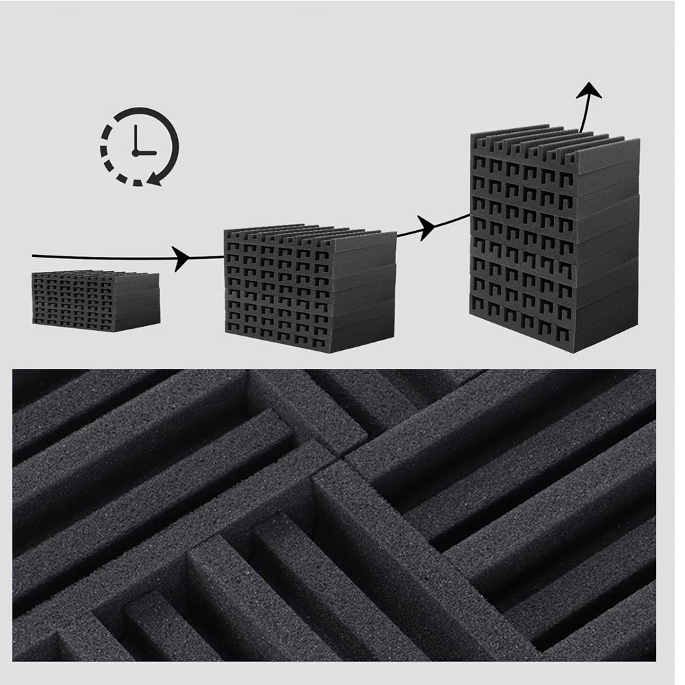 Поглощающая губка звука изготовлена из полиуретановой пены с высокой плотностью 25 кг/м³. За короткое время он может быстро расширяться до максимальной толщины (5 см), и материал не имеет резкого запаха.