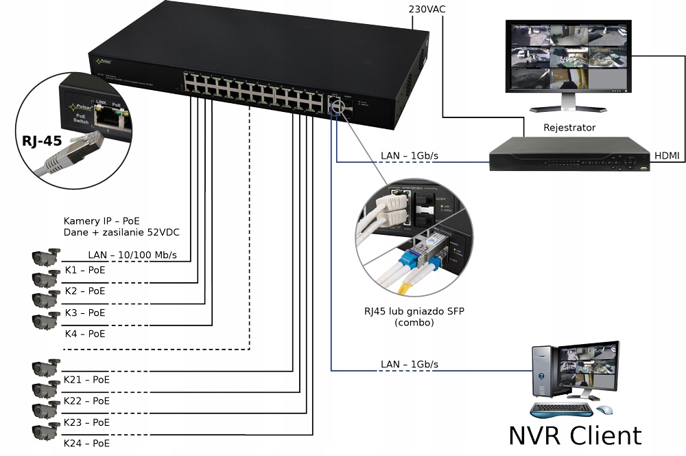 Технология PoE обеспечивает подключение к сети и снижает затраты на установку за счет устранения необходимости прокладывать отдельный кабель питания для каждого устройства. Помимо камер, таким способом можно питать сетевые устройства, использующие эту технологию, например IP-телефон, точку доступа, маршрутизатор.