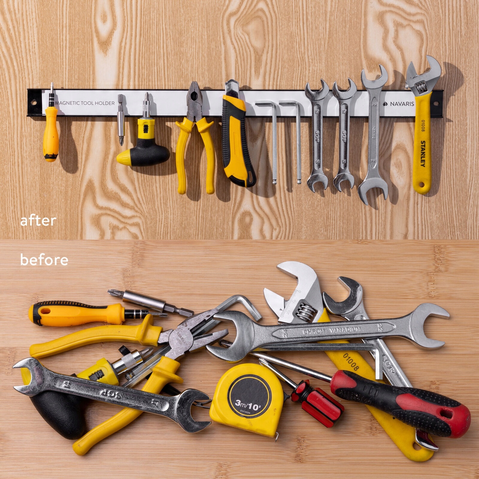 Благодаря практичному магнитному держателю инструменты и другие металлические предметы организованы и всегда под рукой. Идеально подходит для гаража и мастерской.