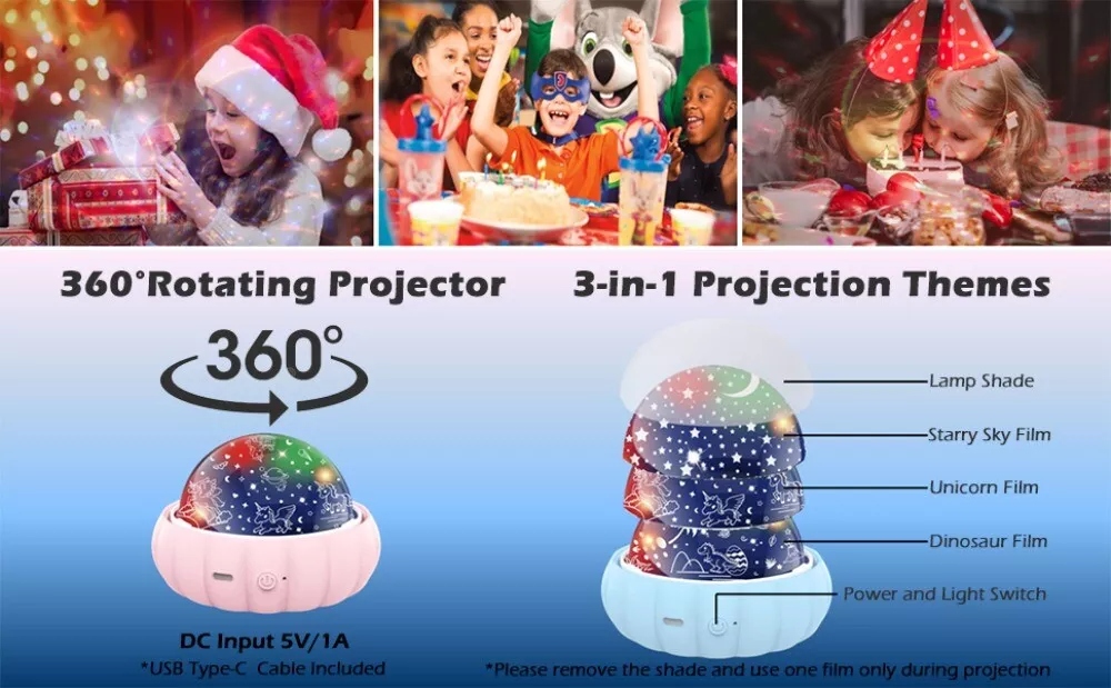 Мы предоставляем три различных проекционных мотива, Starry Sky, Dinosaur и единорог. Внутри есть три проекционные пленки, две из них должны быть удалены перед использованием. Когда вы используете проекцию, пожалуйста, удалите легкий оттенок заранее.