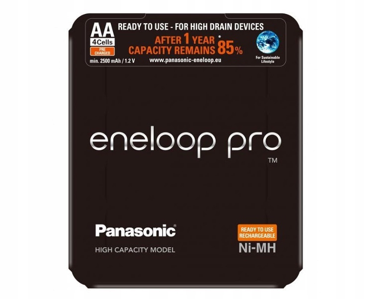 Еще одним преимуществом аккумуляторов Eneloop Pro является то, что они полностью заряжены, т.е. готовы к работе сразу после покупки ( в отличие от других ячеек, для правильной работы которых требуется зарядка или даже процесс форматирования). Что отличает продукт Panasonic от конкурентов, так это также очень долгое время хранения энергии в аккумуляторах, до 85% энергии через год после зарядки.