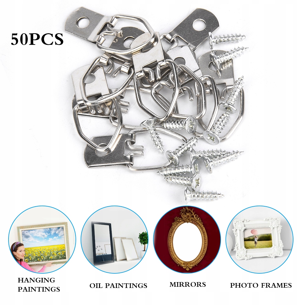 1. Подходит для подвешивания картин, картин маслом, зеркал, фоторамок и т. д. 2. В комплект входит 50 вешалок для фоторамок, каждая с соответствующими винтами для легкой установки. 3. Хорошие аксессуары для рамки с крючками для декоративной росписи 4. Красивый внешний вид, высокое качество и небольшой вес 5. Качественный материал обеспечивает долговечность и стабильность изделия