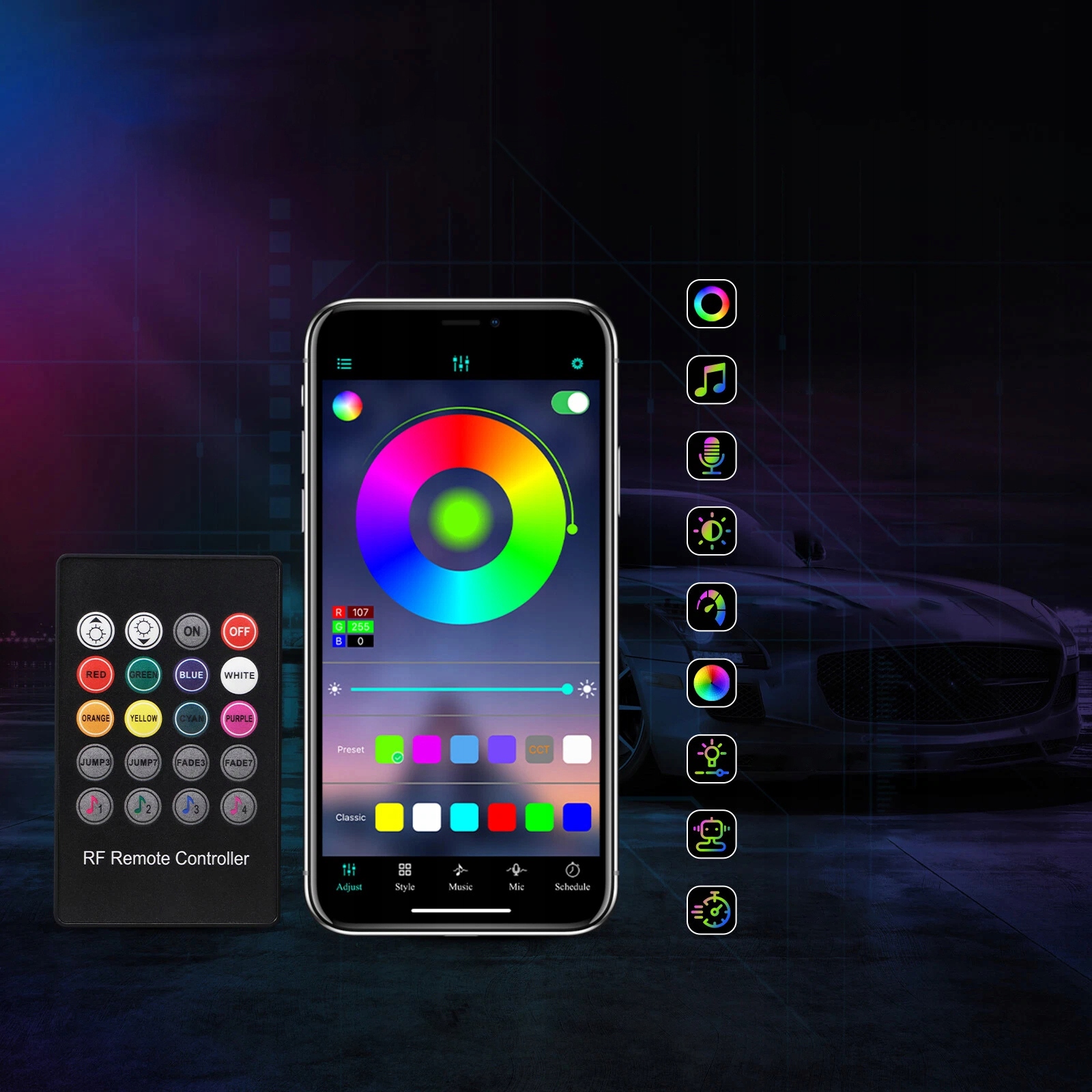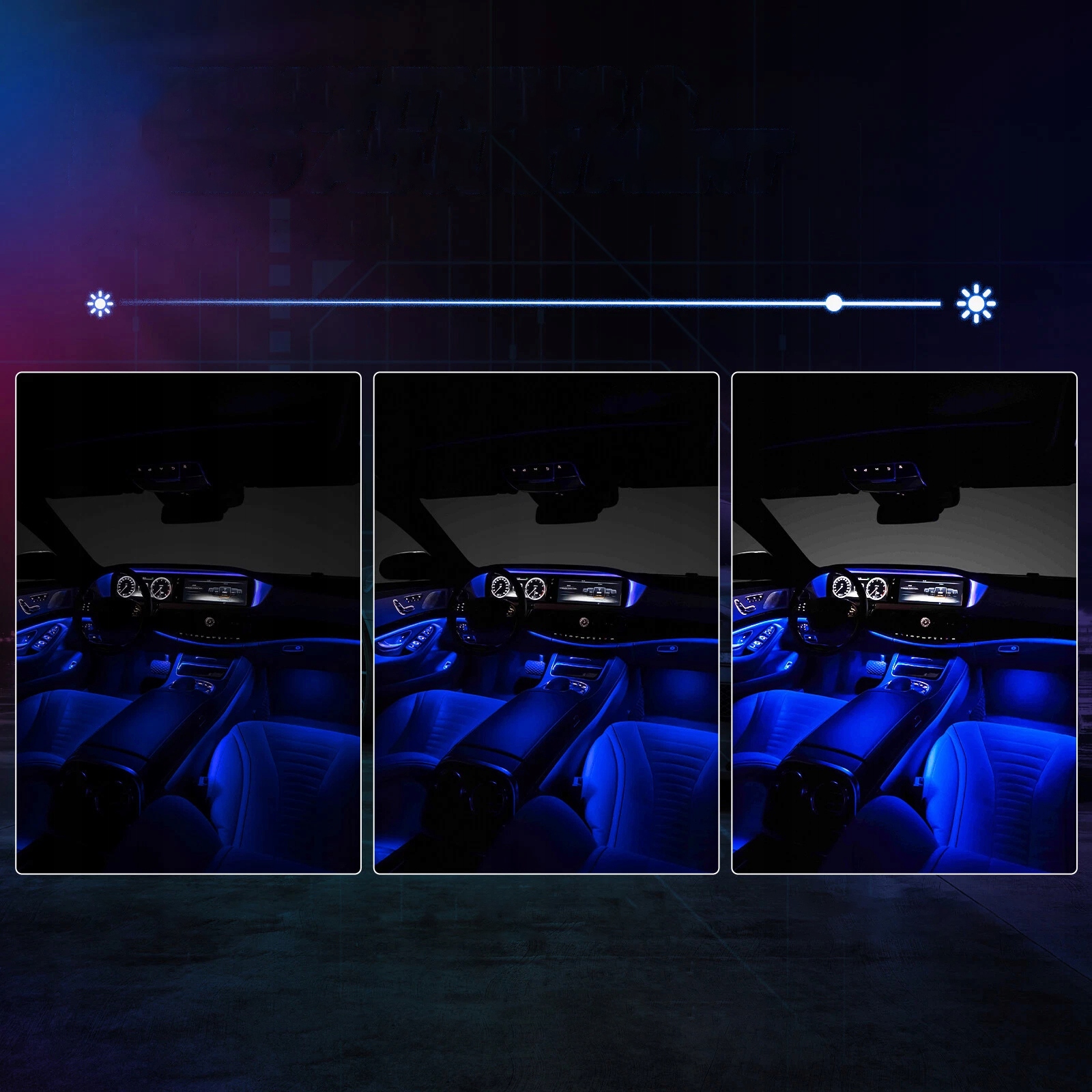 🌈Пульт дистанционного управления и приложение и 16 миллионов цветов: окружающее освещение нашего автомобиля управляется с помощью пульта дистанционного управления/беспроводного приложения, совместимого с iOS или Android. Ошибок нажатия клавиш нет, пульт дистанционного управления более удобен, управление через приложение более интеллектуальное, а цвет, режим изменения цвета, яркость и скорость можно регулировать. Минималистичный дизайн обеспечивает красивое и непревзойденное освещение в автомобиле.