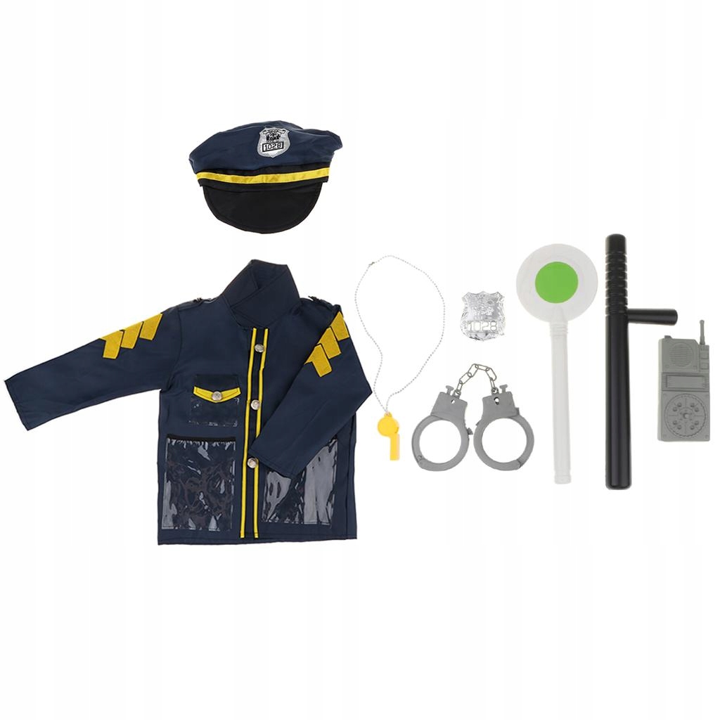 В комплект входит 8 предметов: полицейский костюм, 1 полицейская фуражка, 1 предупреждающий знак, 1 ложка. , 1 наручники, 1 пейджер, 1 свисток, 1 значок.