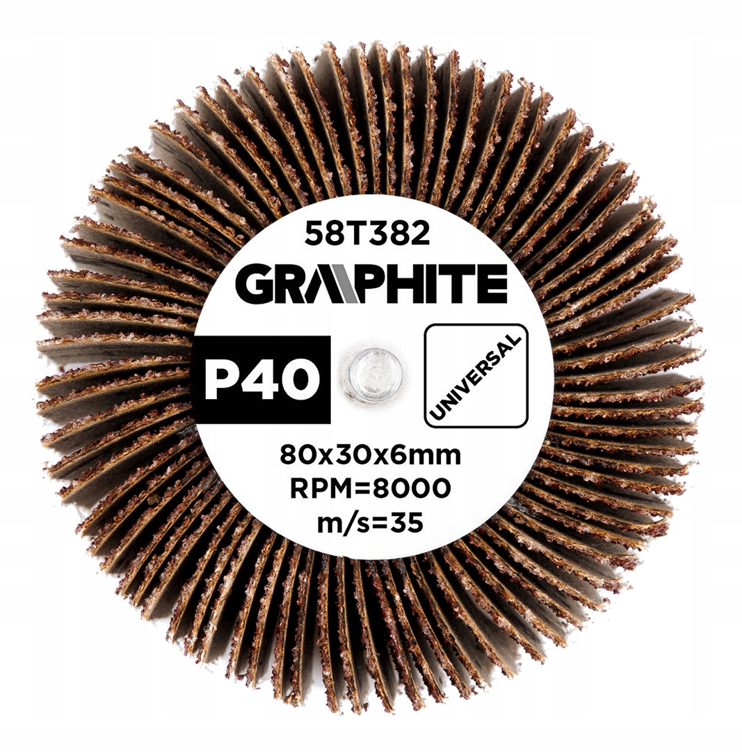 80 x 30 x 6 мм, P40, 58t382, ограниченный связывающий гафит, составляет 80 × 30 × 6 мм и градация P40. Он предназначен для универсального использования, особенно при трудной обработке для достижения мест. Зерно было изготовлено из электрокорунда, а связующее - синтетическая смола. Максимальная скорость вращения, рекомендованная для этого графитового абразива, составляет 8000 об/мин, а рабочая скорость - 35 м/с.