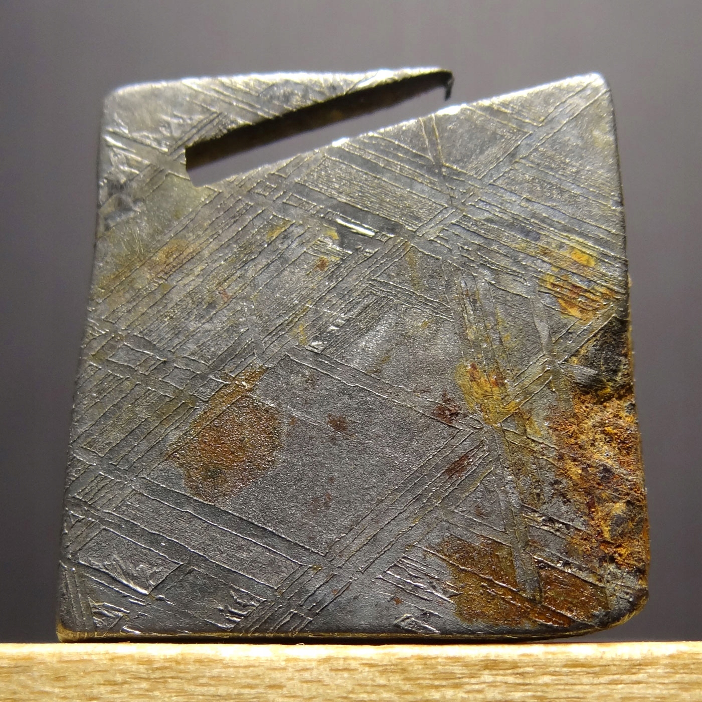 Разрезанный фрагмент метеорита. Очень хорошо видны фигуры Видманштеттена (характерный узор из параллельных ламелей камасита и тэнита).