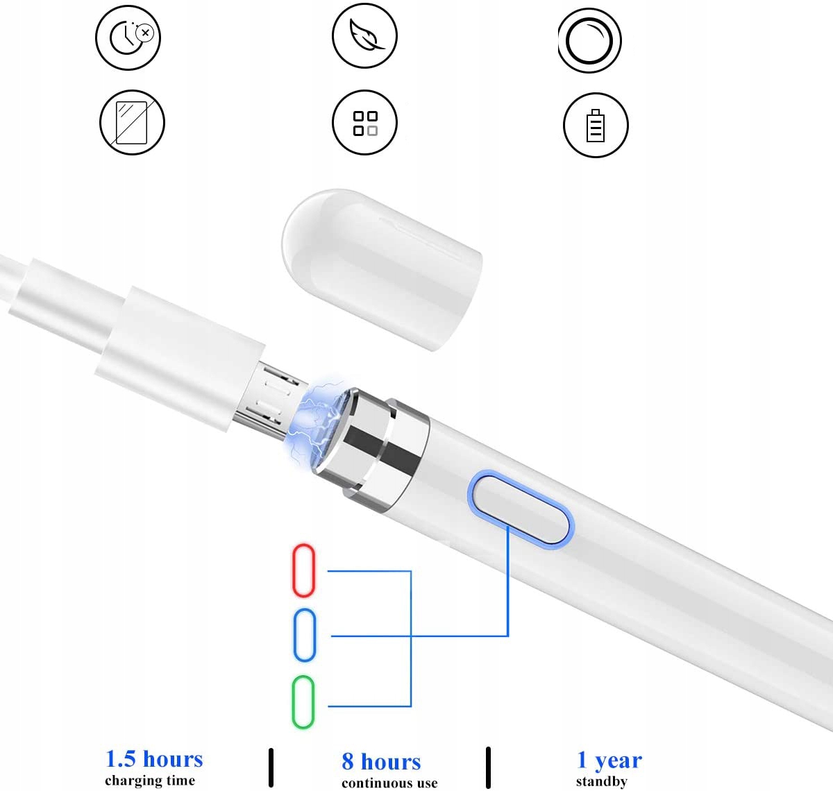 Этот тонкий и элегантный цифровой карандаш со стилусом позволяет вам наслаждаться реалистичным ощущением рисования и письма, как при использовании настоящего карандаша на бумаге. Дизайн одной кнопки, прост в эксплуатации; Никакого Bluetooth не требуется, никаких приложений не требуется.