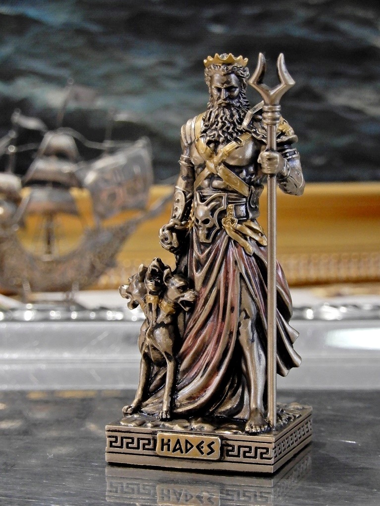 Приглашаю вас приобрести красивую статуэтку, изображающую греческого бога подземного царства Аида, также известного как Плутон. Рядом с ним верный Цербер, трехголовый пес.