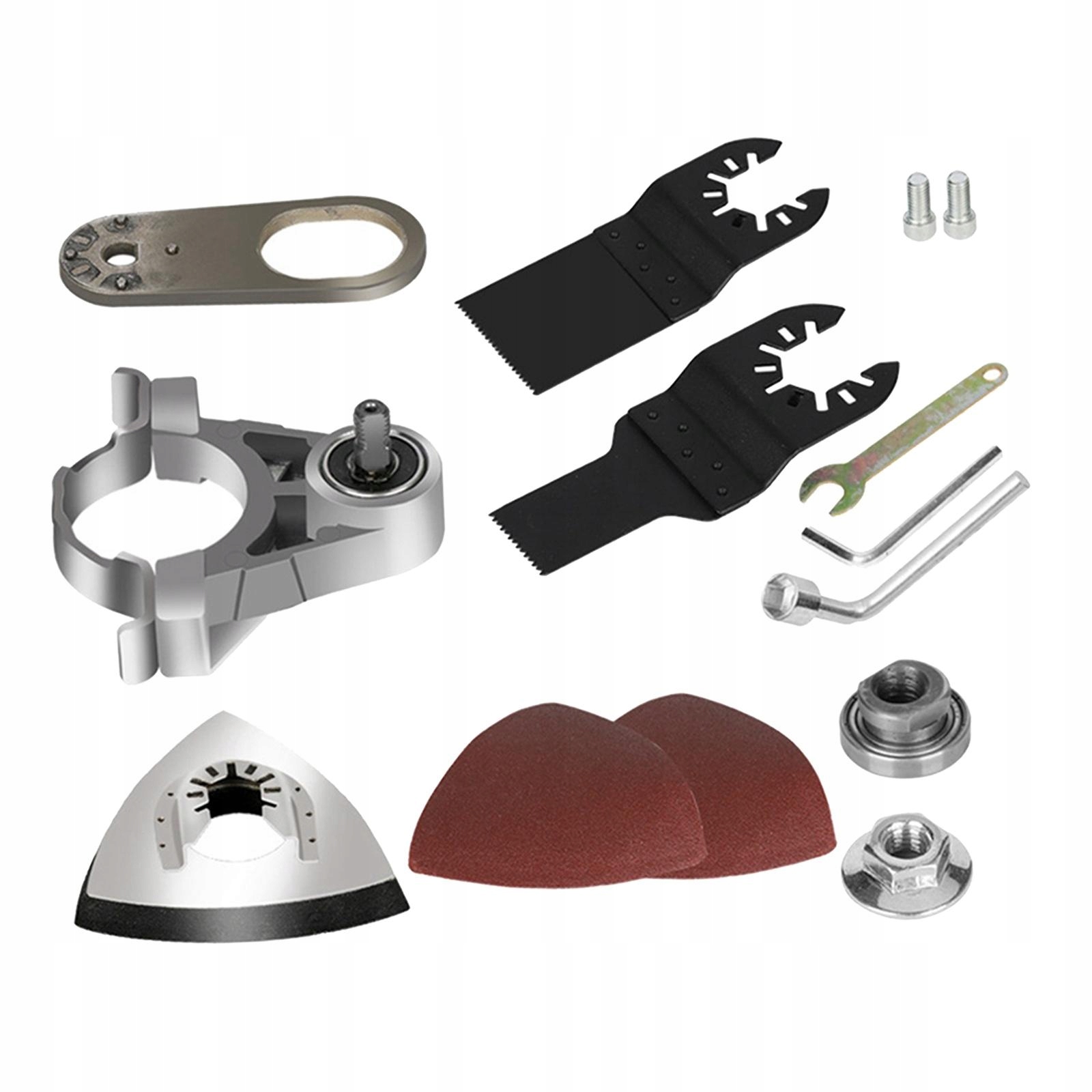 Этот набор содержит различные аксессуары, такие как универсальная головка, эксцентричный вал, винты, блок баланса, наждачная бумага, лезвия и т. Д. Один набор инструментов может удовлетворить различные потребности в области резки, шлифования и полировки.