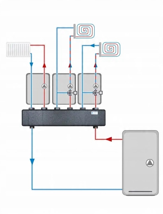 - Установлен на стене между тепловым или холодным источником и группами насосов.