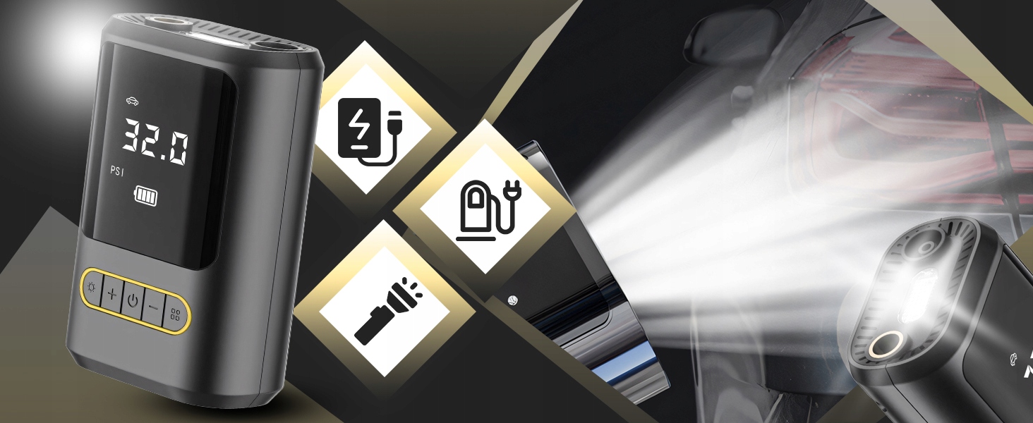 - Беспроводной светодиодный ЖК-компрессор со встроенным аккумулятором.