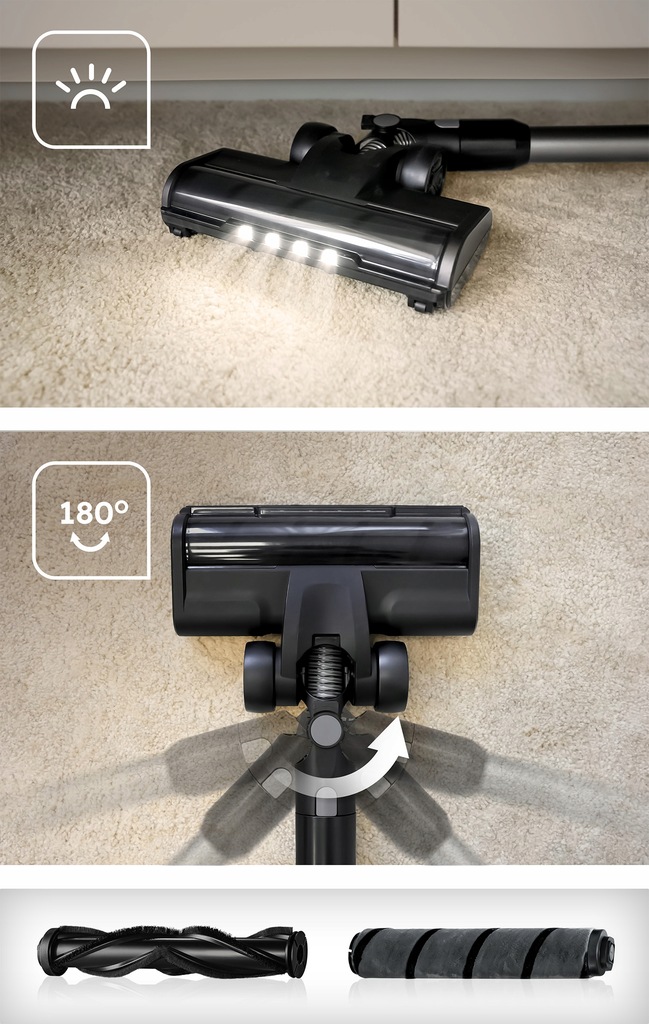 Основная щетка оснащена механизмом, который поворачивается на 180°, что позволяет легко добраться до всех уголков и щелей.