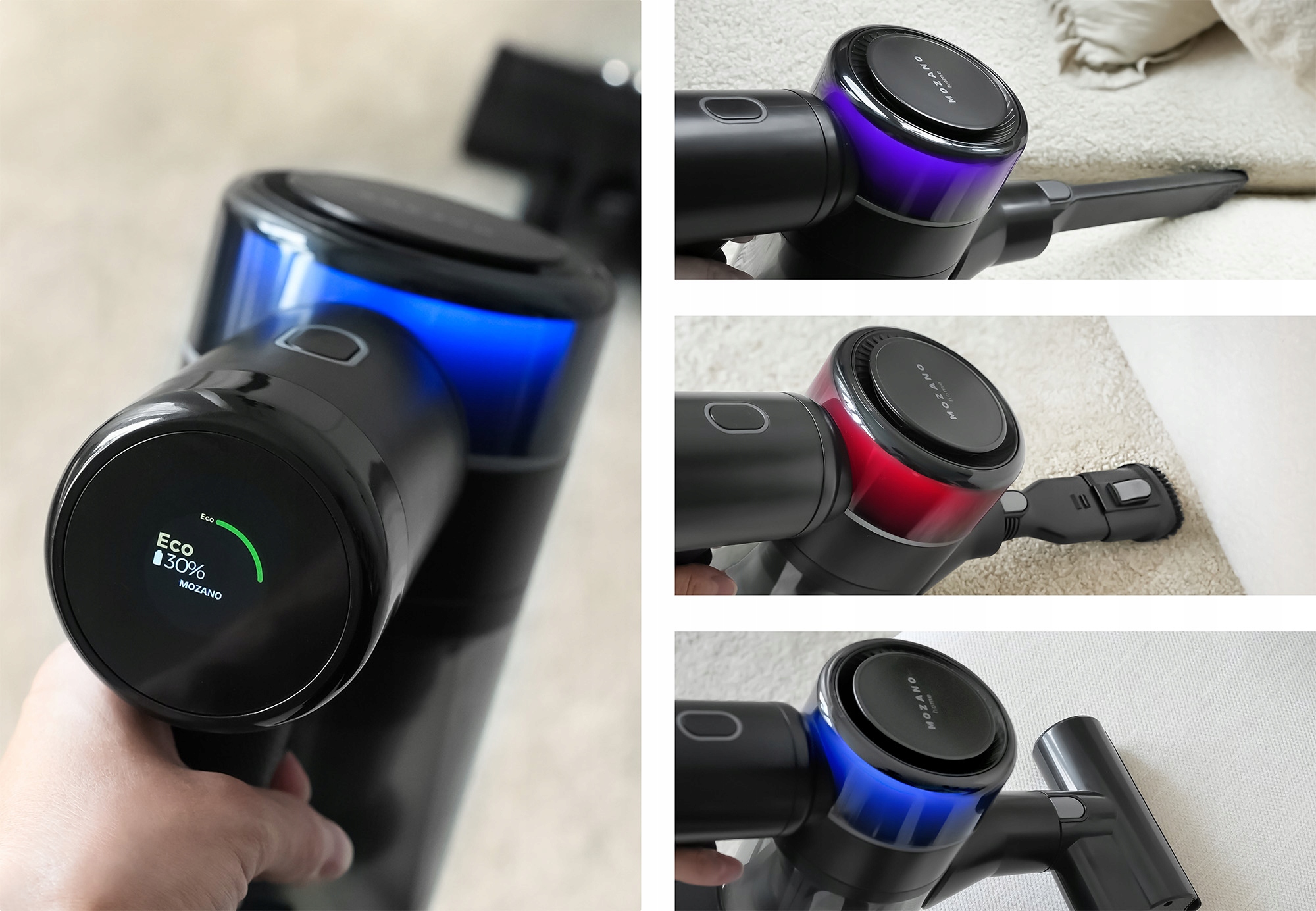 Пылесос Mozano Handy Pro имеет три режима работы (ECO, MID, TURBO), адаптируясь к различным потребностям уборки.