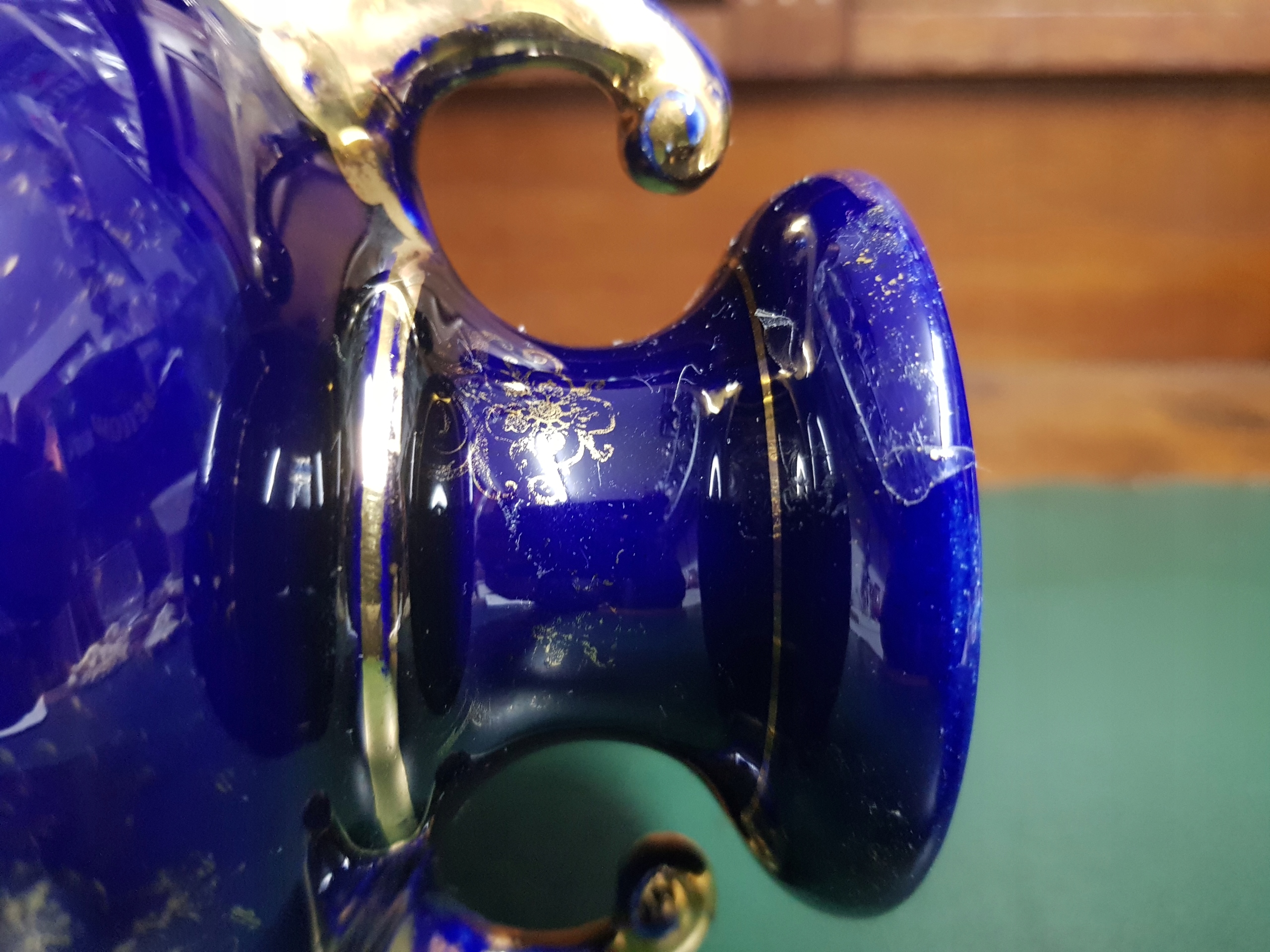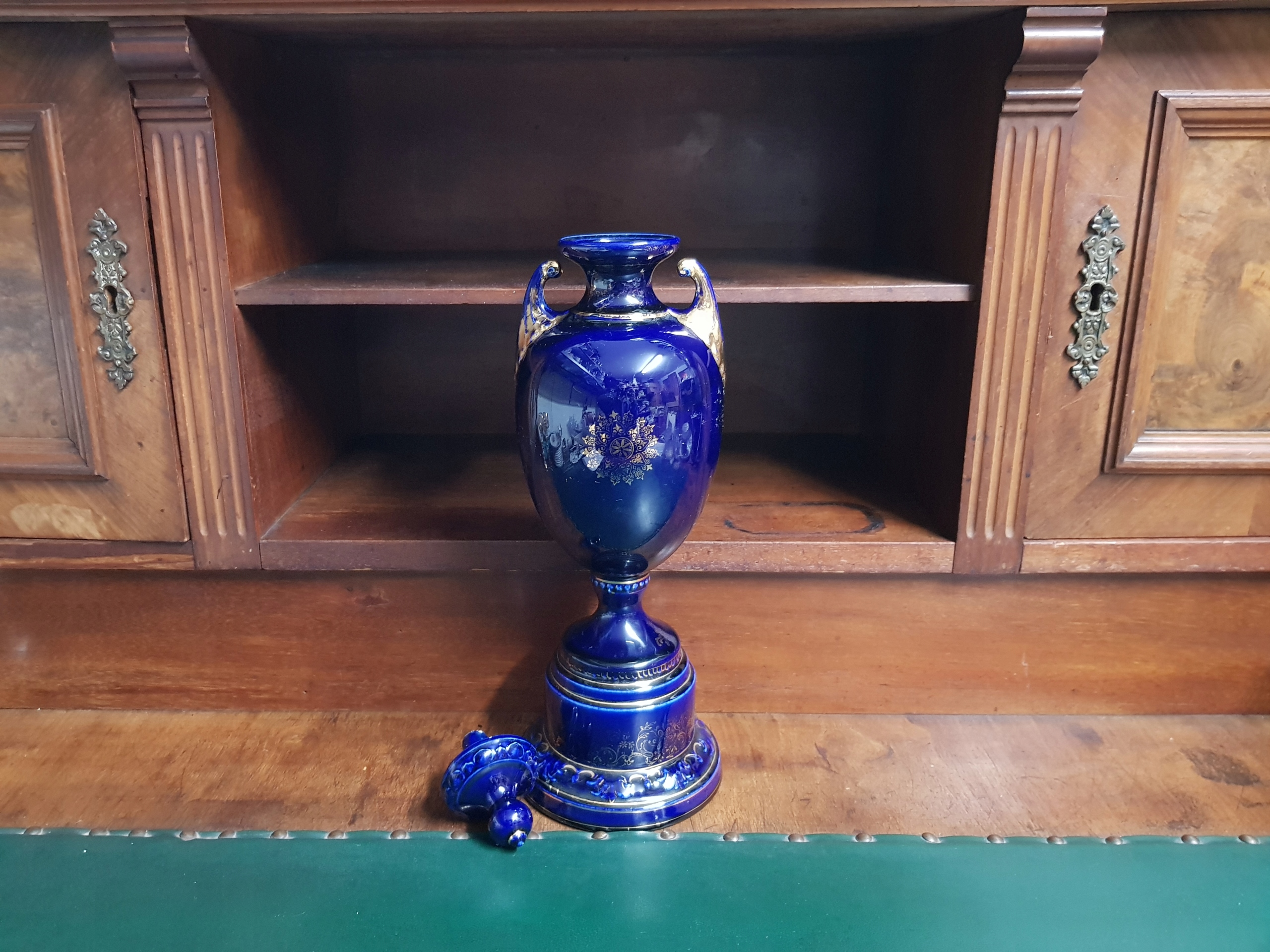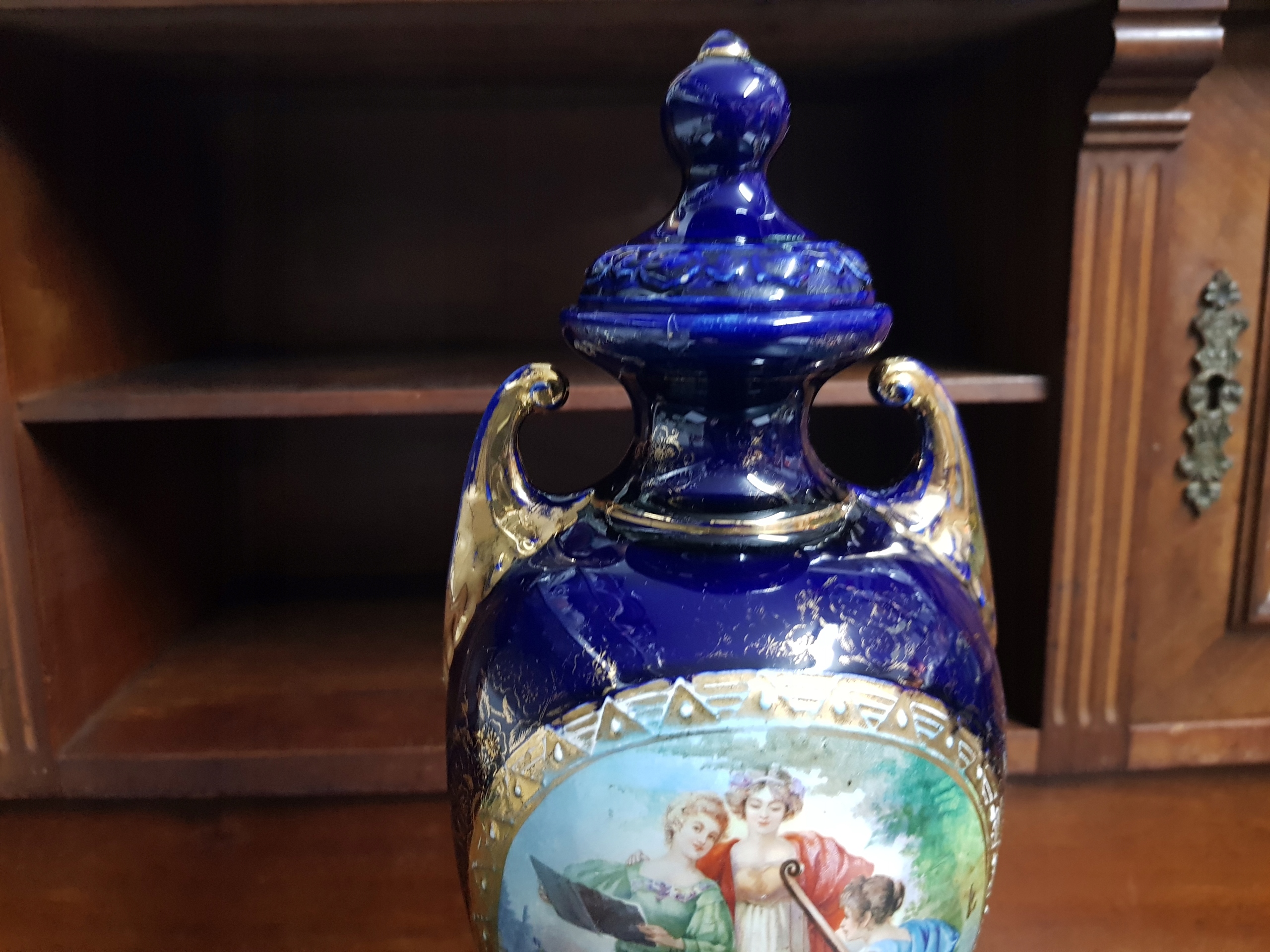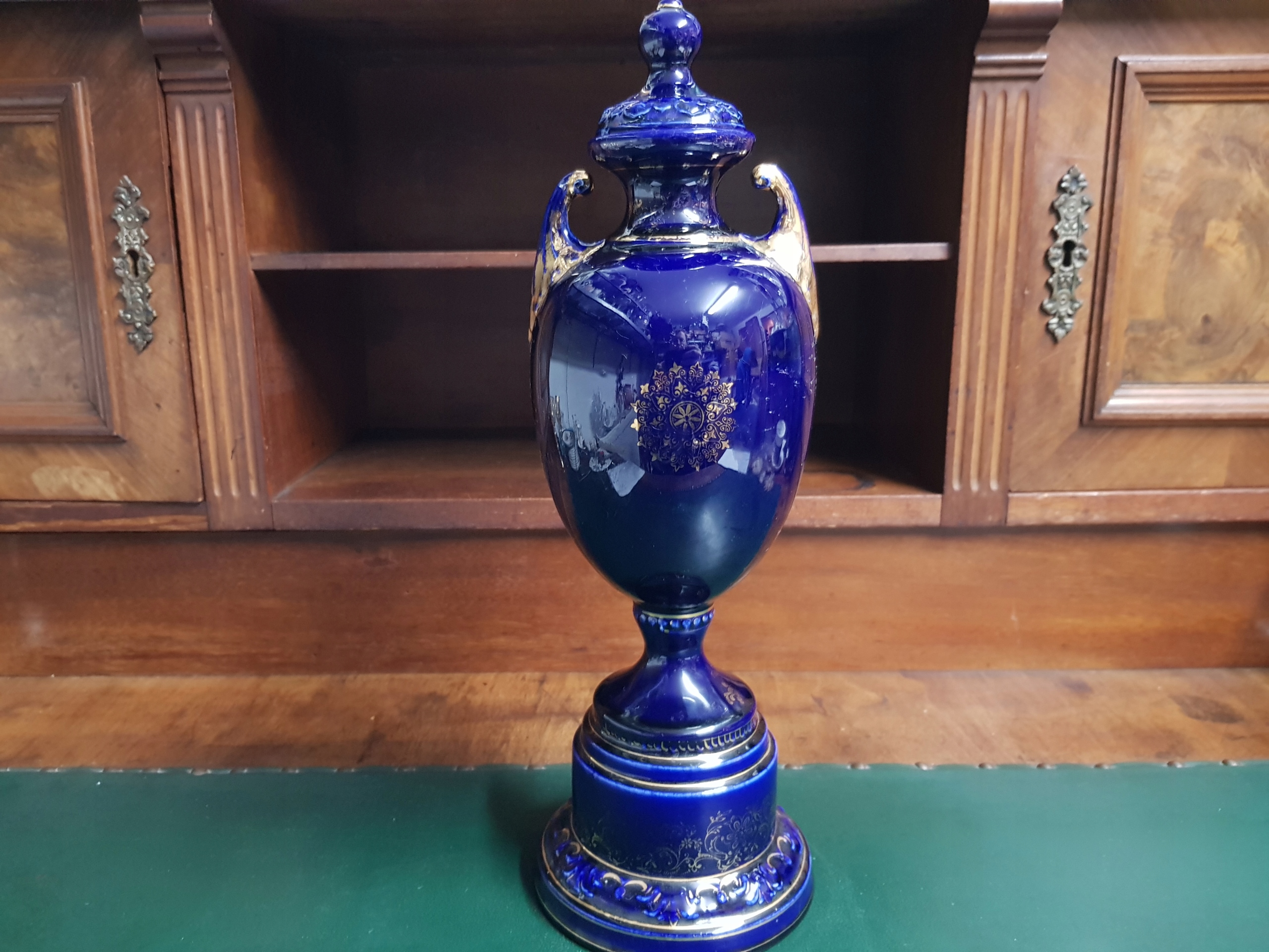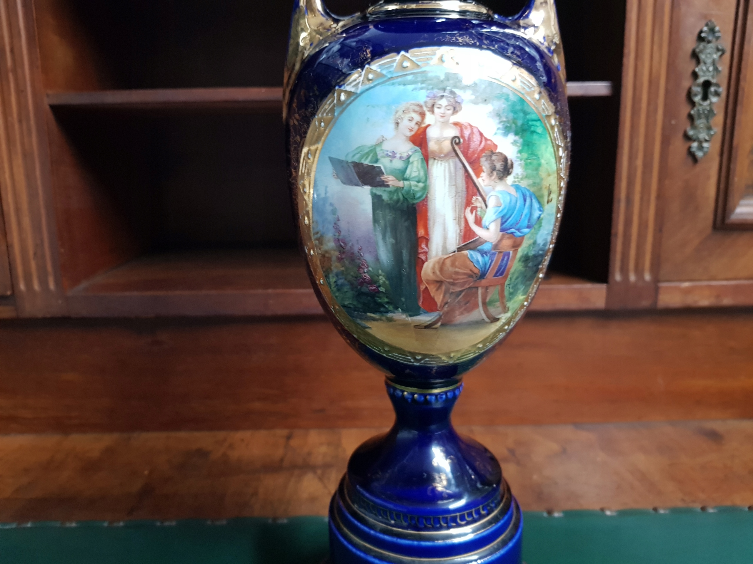 Предмет аукциона - кобальтовая ваза-амфора, украшенная жанровой сценой и позолотой.Позолота местами стёрта.(фото).Около 1910-20 гг.