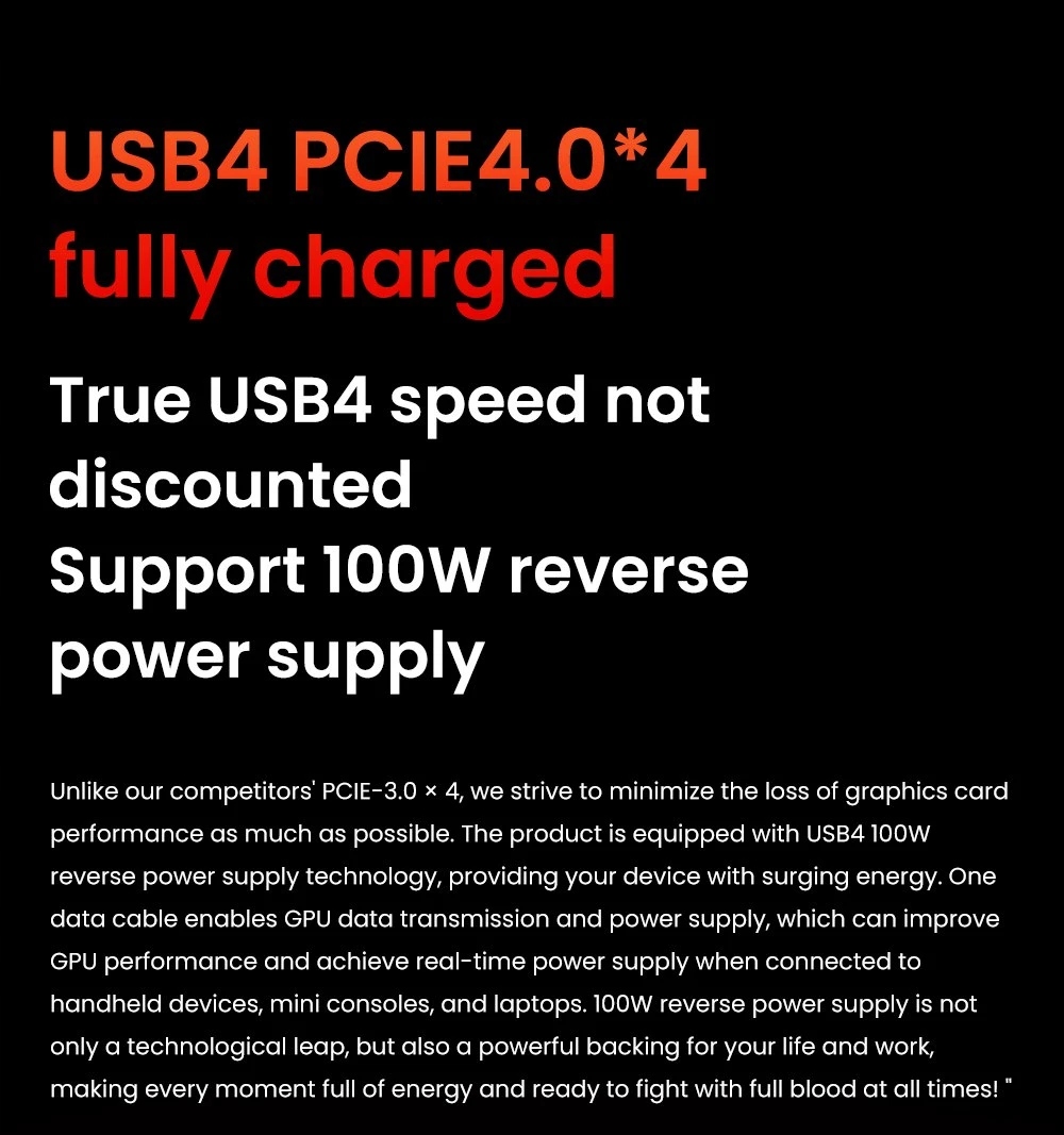 оснащен технологией обратного источника питания USB4 100 Вт, один для передачи данных выполняет передачу данных GPU и источник питания. После подключения к портативным устройствам мини -хосты и ноутбуки могут повысить эффективность графического процессора и обеспечить реальное питание.
