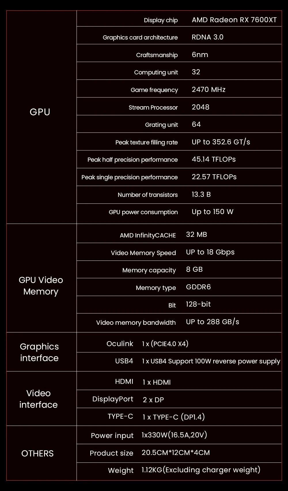 eGpu Dection Station Aoostar XG76XT с графическим процессором AMD Radeon RX 7600XT, 8 ГБ ОЗУ, 128 бит, 1 * USB 4.0, 1 * Olulink, 1 * HDMI, 2 * DP, 1 * Type-C, обратный зарядка 100 W 7600XT