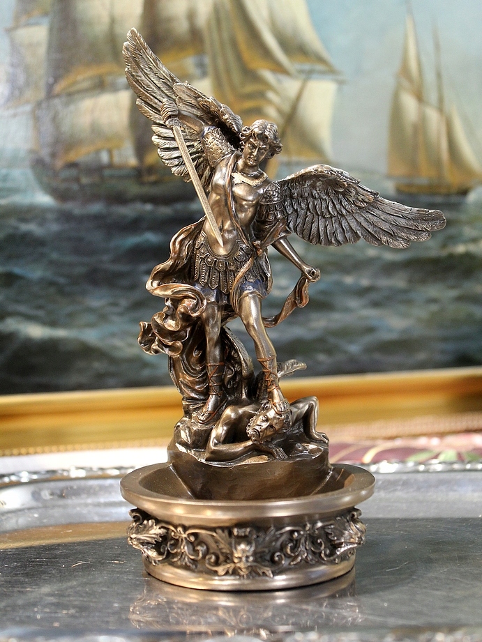 У ноги архангела находится teddy bowl , предназначенная для святой воды. Целое может действовать как практический религиозный элемент или символическое священное украшение . Stantler идеально подходит для дома, в часовне, рискнильном или приходском офисе , а также в качестве религиозного дара для священника, религиозной сестры или глубоко верного человека .