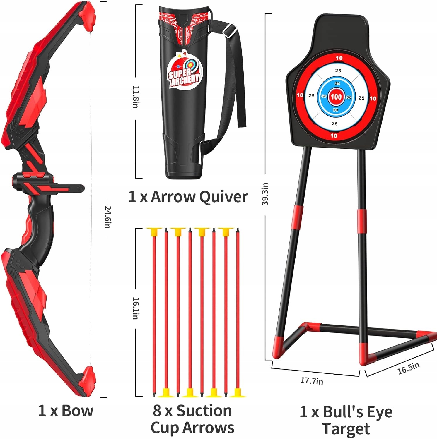 Набор содержит отличный лук, 8 выстрел с всасывающими чашками, двухфункциональный щит и стрелки. Это отличный способ разработать координацию и точность руки, а также отличная форма веселья