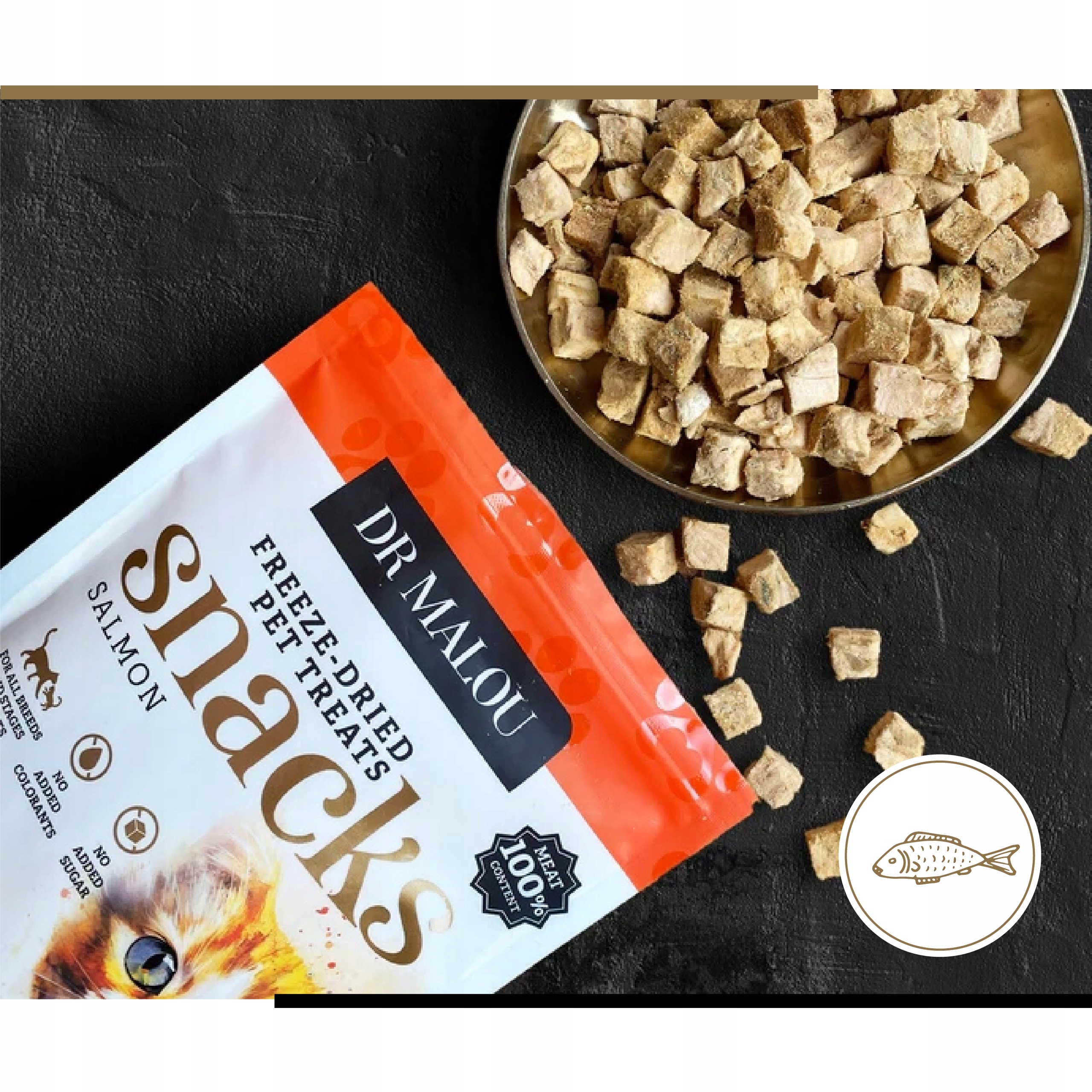 Dr Dr Malou Snacks Salmon до Дополнительная пища для взрослых кошек . Он имеет форму кубиков мяса, которые составляют 100% замораживаемое мясо лосося. Он не содержит искусственных добавок, консервантов, красителей или наполнителей. Это идеальный выбор для вашей кошки!