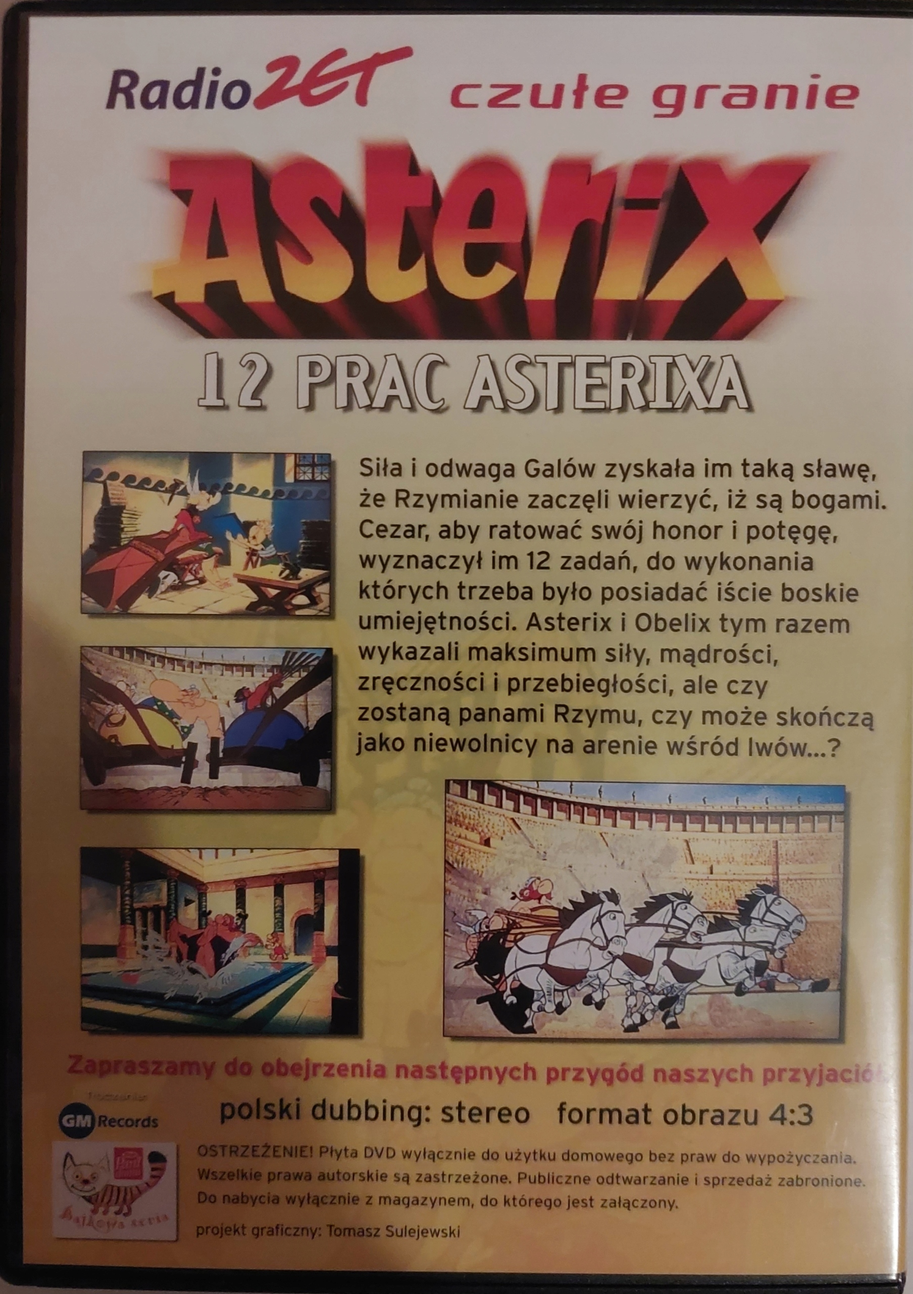 ASTERIX VCD 12 РАБОТЫ АСТЕРИКСА Сила и храбрость галлов принесли им такую известность, что римляне начали верить, что они боги. Цезарь, чтобы спасти свою честь и власть, поручил им 12 задач, для выполнения которых требовалось поистине божественное мастерство. На этот раз Астерикс и Обеликс проявили максимум силы, мудрости, ловкости и хитрости, так что станут ли они властителями Рима, а может быть, окажутся рабами на арене среди львов...? Неиспользованный диск Неиспользованный диск