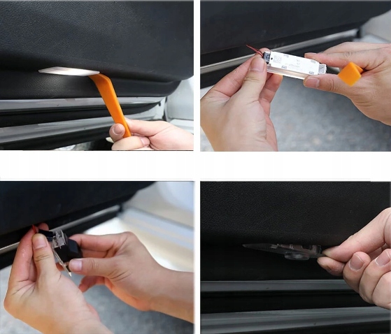 - все модели с подсветкой в нижней части дверей размером 5,5 см x 2,5 см В комплекте 2 шт. Имеют регулируемый угол освещения, можно настроить, как должен светиться логотип. Корпус алюминиевый сзади (лучше рассеивает тепло), а не пластиковый как у других
