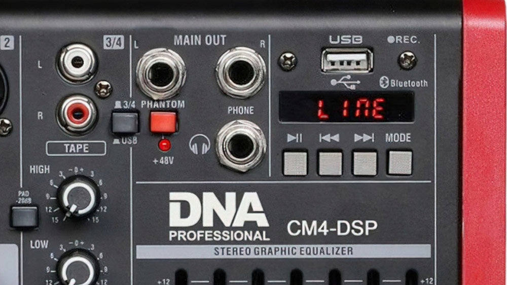 ДНК CM4-DSP-это компактный 4-канальный звуковой микшер USB с MP3-плеер и стандарт беспроводной связи Bluetooth. Устройство оснащено процессором цифрового эффекта, предлагающего 99 различных звуковых модуляций, графического эквалайзера и фантома +48 В питания, благодаря которой можно придать постоянное напряжение некоторым аудиоустройствам, инструментам или микрофонам. Это отличное решение для вокалистов, групп, мобильных диджеев, а также для компаний для мероприятий и различных типов учреждений.