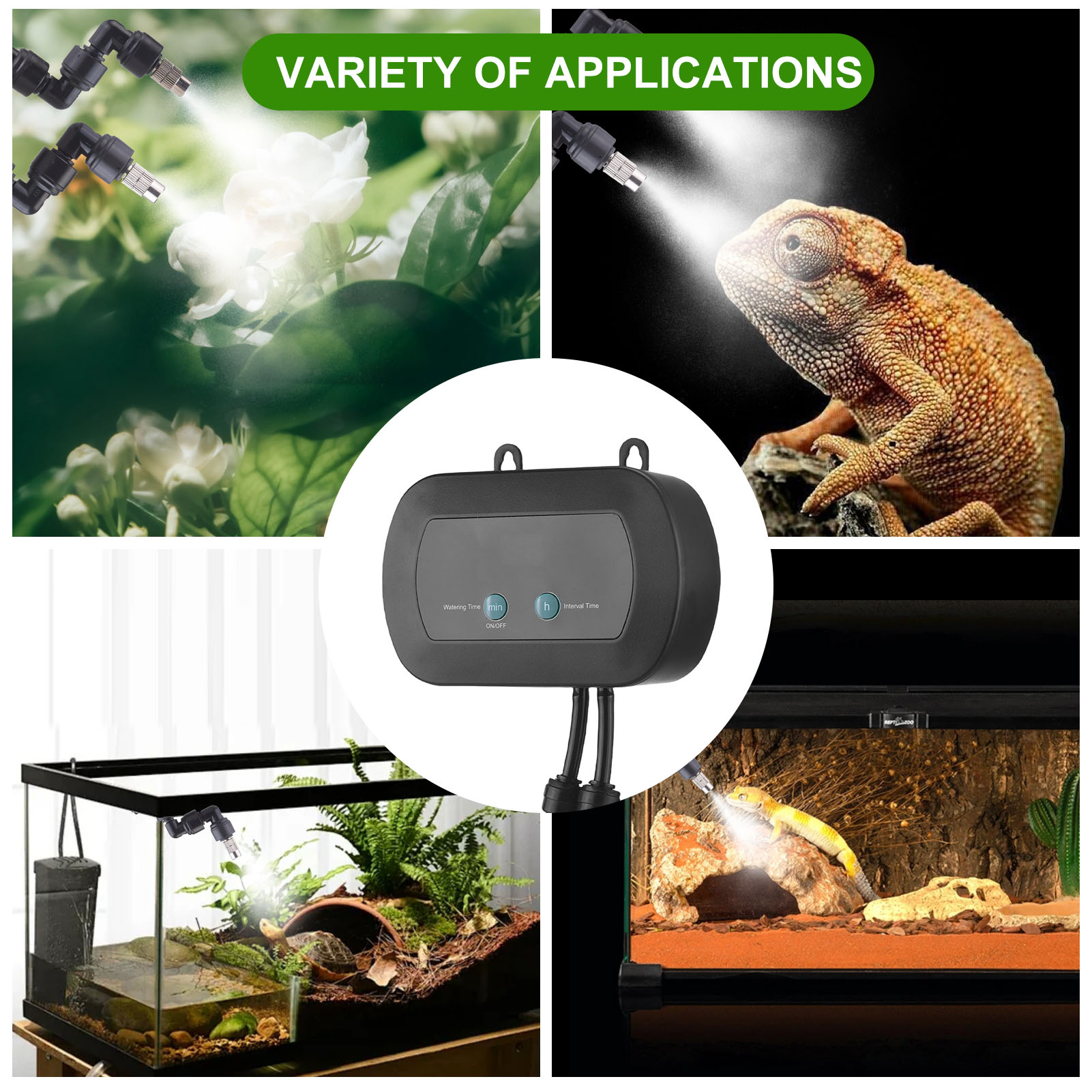 5. Универсальное использование: идеально подходит для ряда сценариев, от поддержания террариума до хамелеонов, змей и лягушек до увеличения эстетики сада. Эта автоматическая система полива служит идеальным решением для распыления, увлажнения, охлаждения или очистки, как для внутренней, так и для внешней среды.