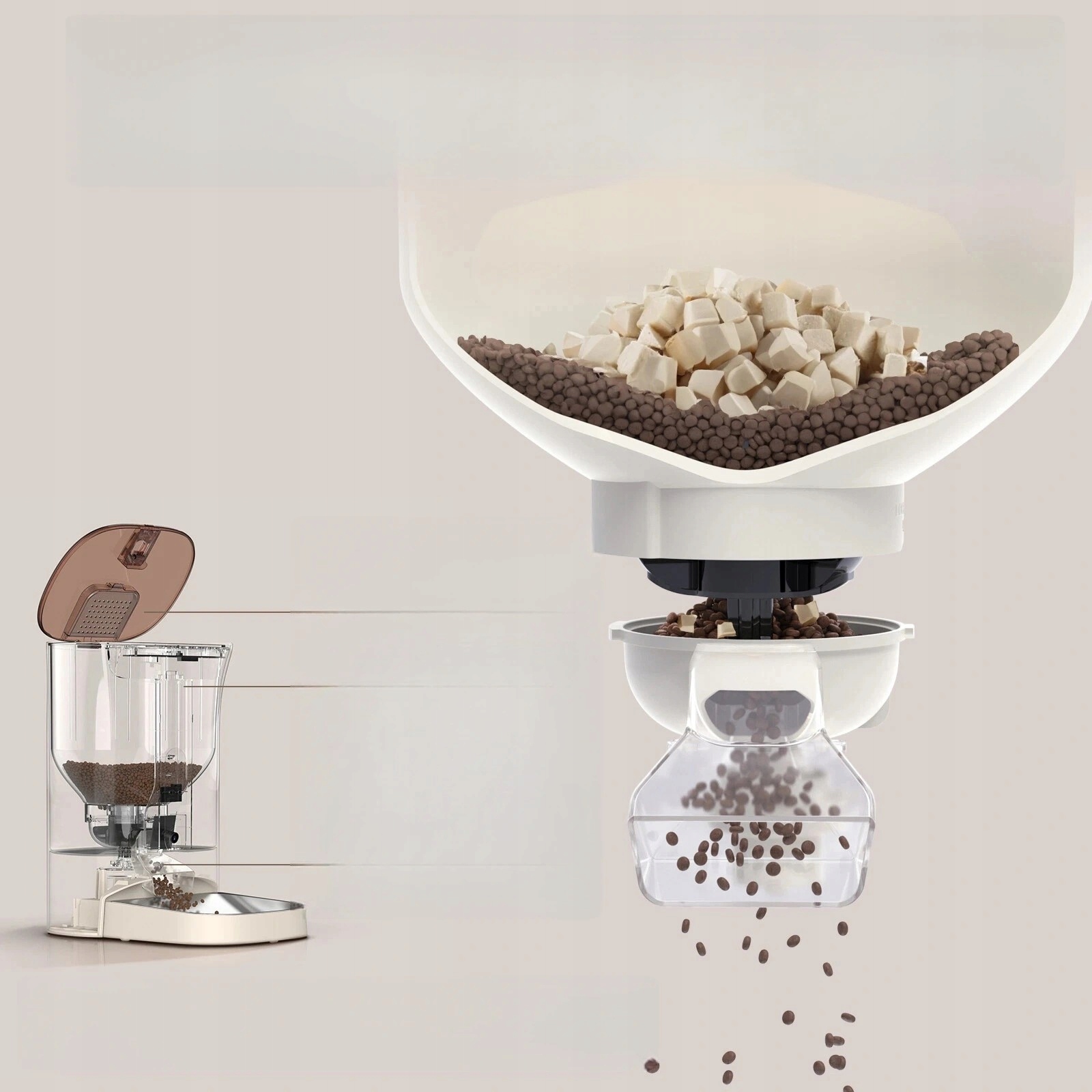 Контейнер для хранения 15-30 дней сухой пищи (в зависимости от количества пищи). Съемная чаша из нержавеющей стали (нержавеющая сталь 304) предотвращает «черный подбородок». Инфракрасный датчик предупреждает о оставшемся уровне пищи с голосовой сигнализацией + мигающим светодиодом (параллельно уведомление о приложениях).