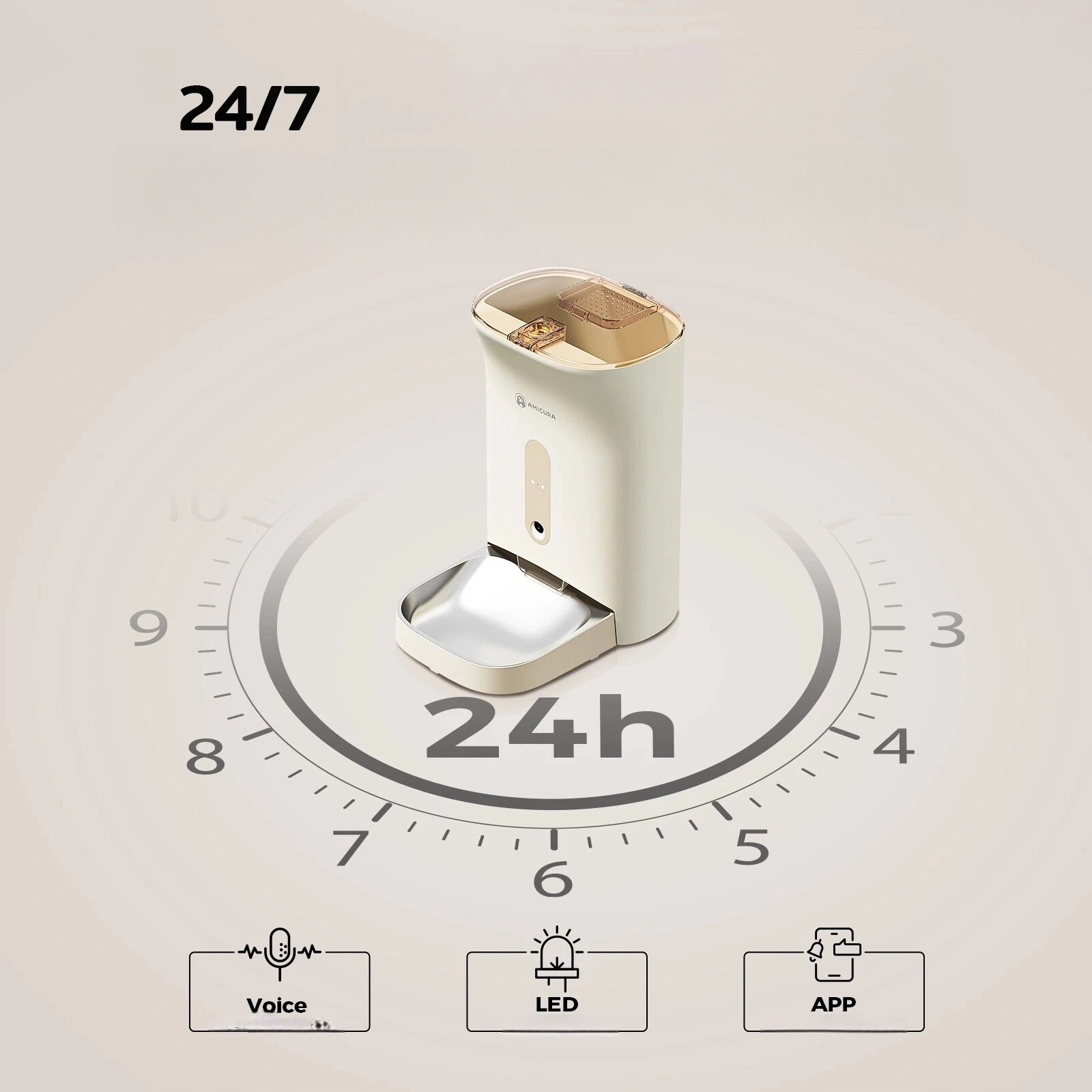 Amicura F1 Pro - это инновационный кормушка с 2K -камерой и до 7 литров емкости, которая обеспечивает животным постоянным доступом к свежим блюдам. Фидер был создан для комфорта, здоровья и комфорта ваших питомцев. Это позволяет кормить 2 животных одновременно, даже если вас нет дома. Запланируйте свою диету и используйте приложение для кормления и мониторинга для ваших животных.