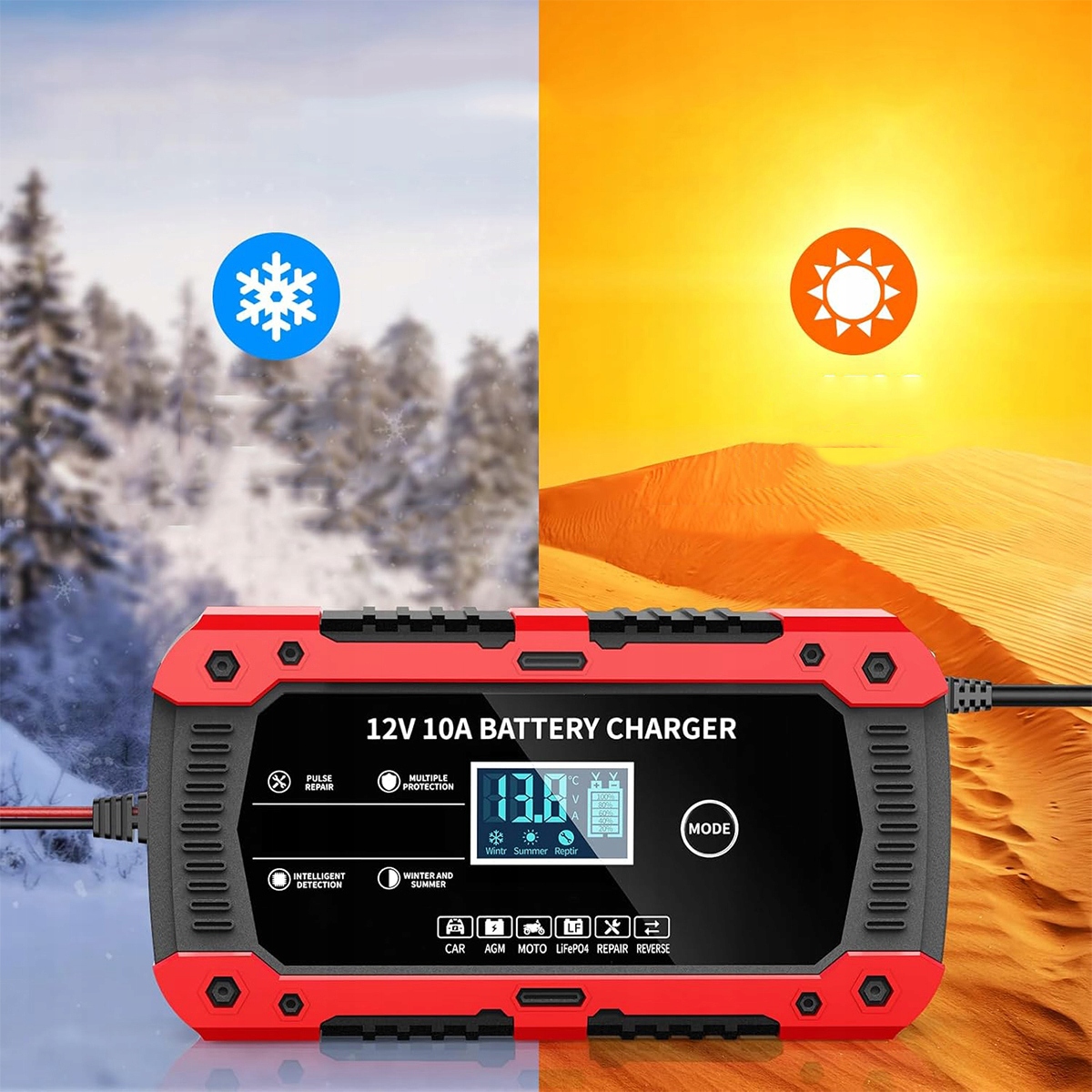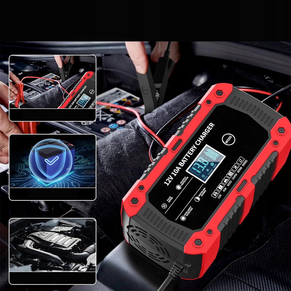 Car Charger 10a, интеллектуальное, полностью автоматическое автомобильное зарядное устройство 12 В, зарядное устройство с температурной компенсацией и ЖК -дисплей для автомобилей, мотоциклов, грузовиков (красный и черный) h1>
