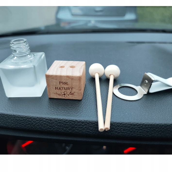 Стеклянный диффузор с деревянными элементами для ароматерапии в автомобиле. Он прикреплен к решетке воздуха (вентиляция, кондиционер). Окружите себя естественным запахом, пусть эфирные масла могут повлиять на ваши чувства и эмоции. Естественный запах - альтернатива химическим новичкам. Они не только пахнут, но и позволяют стимулировать нашу концентрацию (так важную в автомобиле), уравновешивать эмоции, но и поддерживать во многих заболеваниях, таких как головная боль, расстройства движения. Толстое стекло с декоративным деревянным стеклом с крышкой и палочками усилило запах