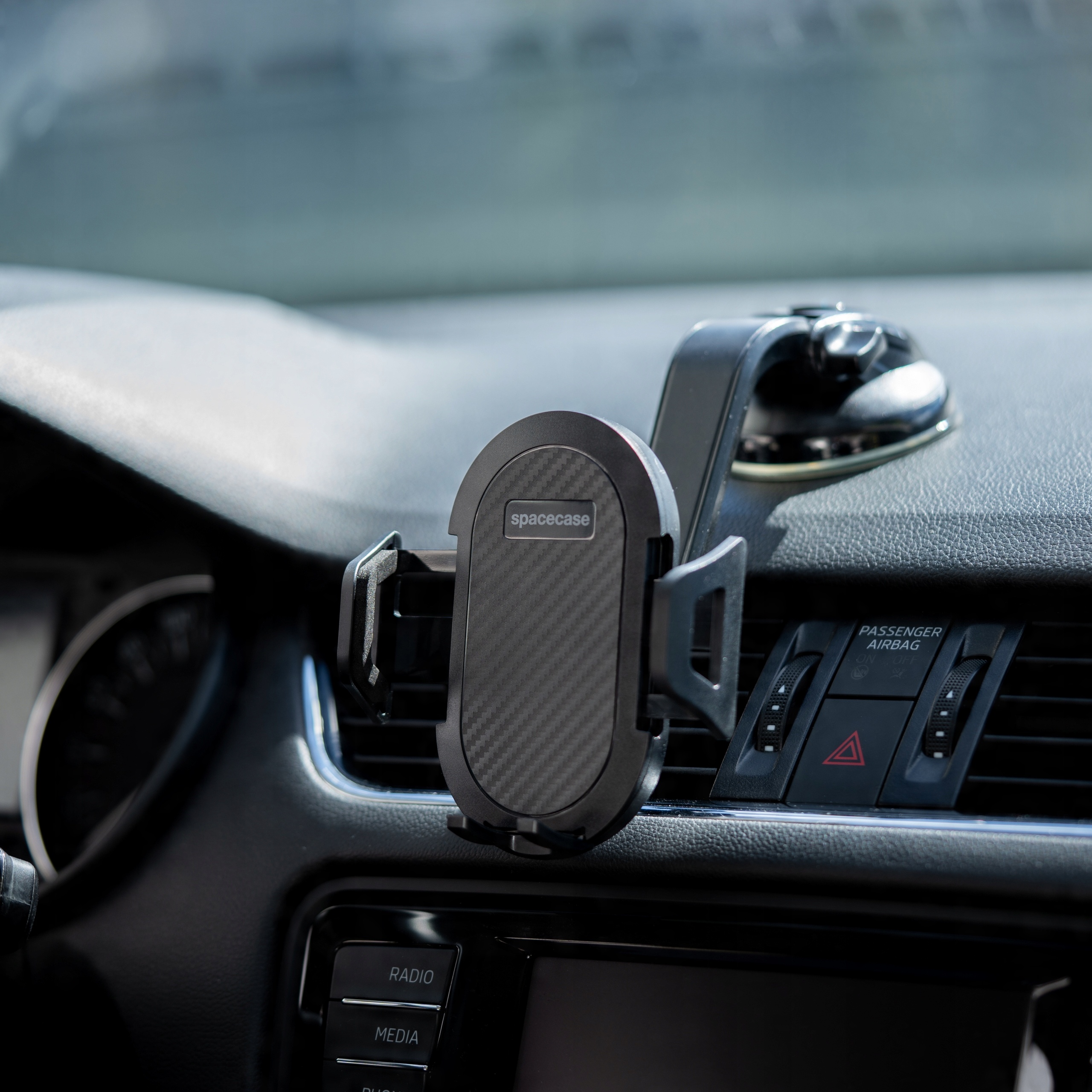 Современный, стильный многоразовый держатель на присоске. Удобные дужки гарантируют устойчивость во время сложных поездок, а силиконовые боковины предотвращают выпадение и повреждение телефона во время вождения.