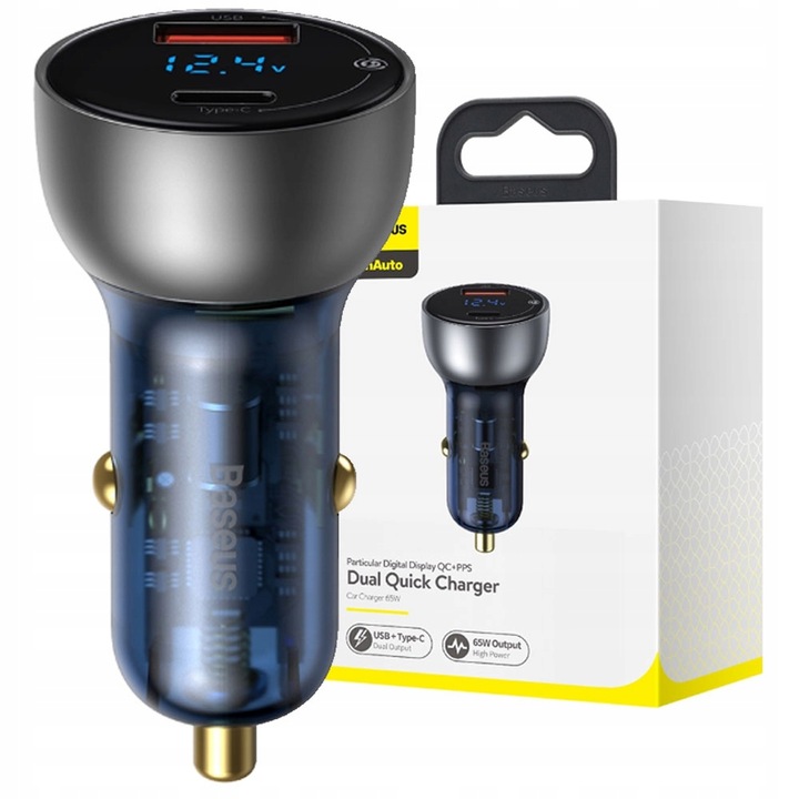 АВТОМОБІЛЬНИЙ ЗАРЯДНИЙ ПРИСТРІЙ BASEUS БЛОК ЖИВЛЕННЯ USB-A USB-C З PD QC ДИСПЛЕЄМ 65 Вт