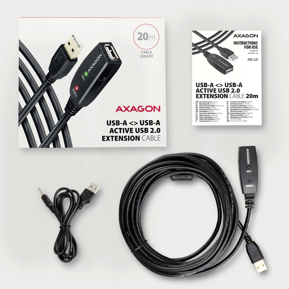 Активный расширяющийся кабель USB 2.0 Axagon ADR-220 с длиной 20 метров идеально подходит для подключения компьютера к USB-устройству, такому как мышь, клавиатура, веб-камера, принтер, сканер, платтер и другие. Активный кабель USB Repeater укрепляет передачу сигнала и позволяет вам подключать значительно более отдаленные USB -устройства, чем при использовании пассивных кабелей. Диапазон кабеля может быть дополнительно увеличен, используя несколько кабелей подряд.