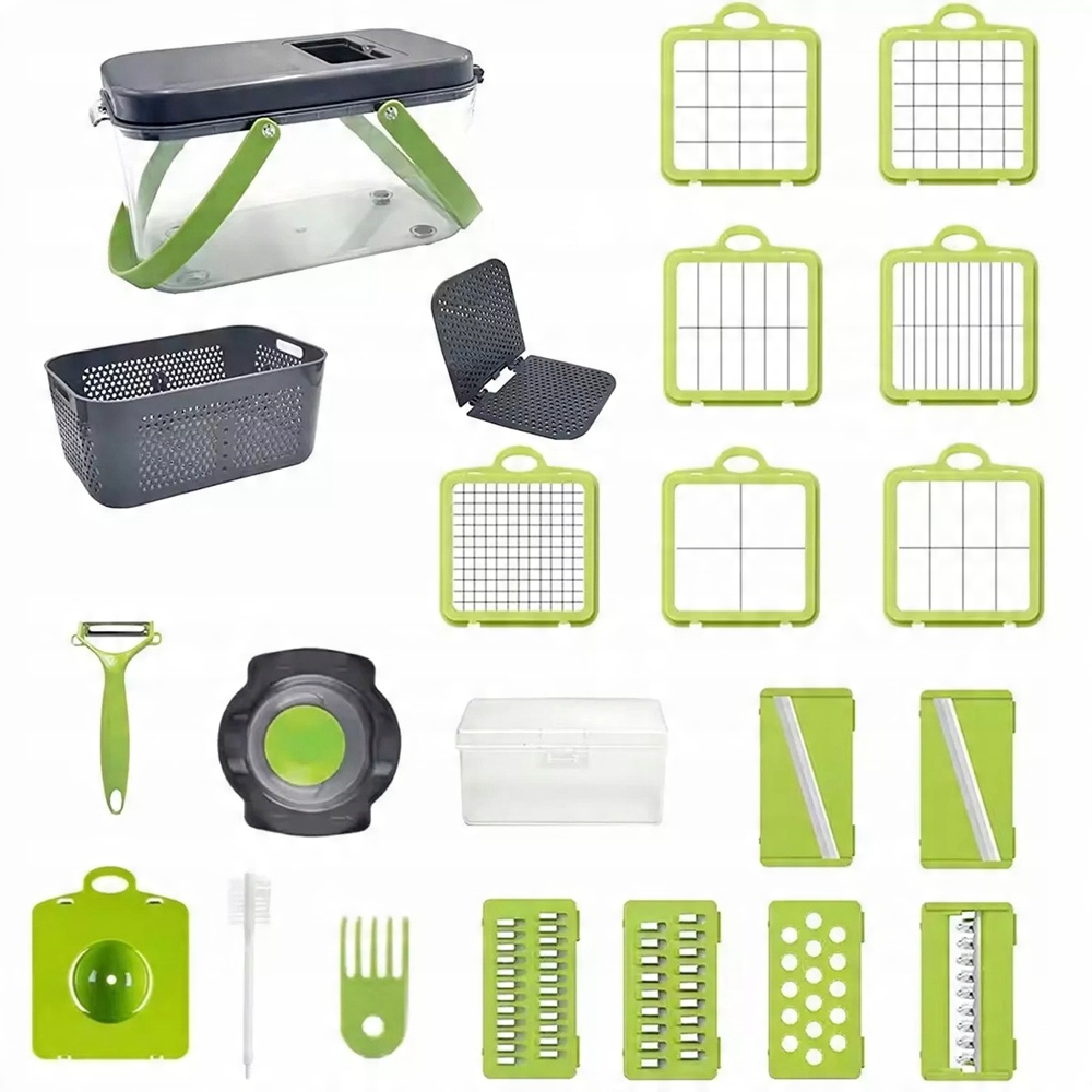 содержит 13 заменяемых лезвий из нержавеющей стали для разрезания фруктов и овощей в различные формы и размеры, обеспечивая гибкость для всех потребностей приготовления пищи.