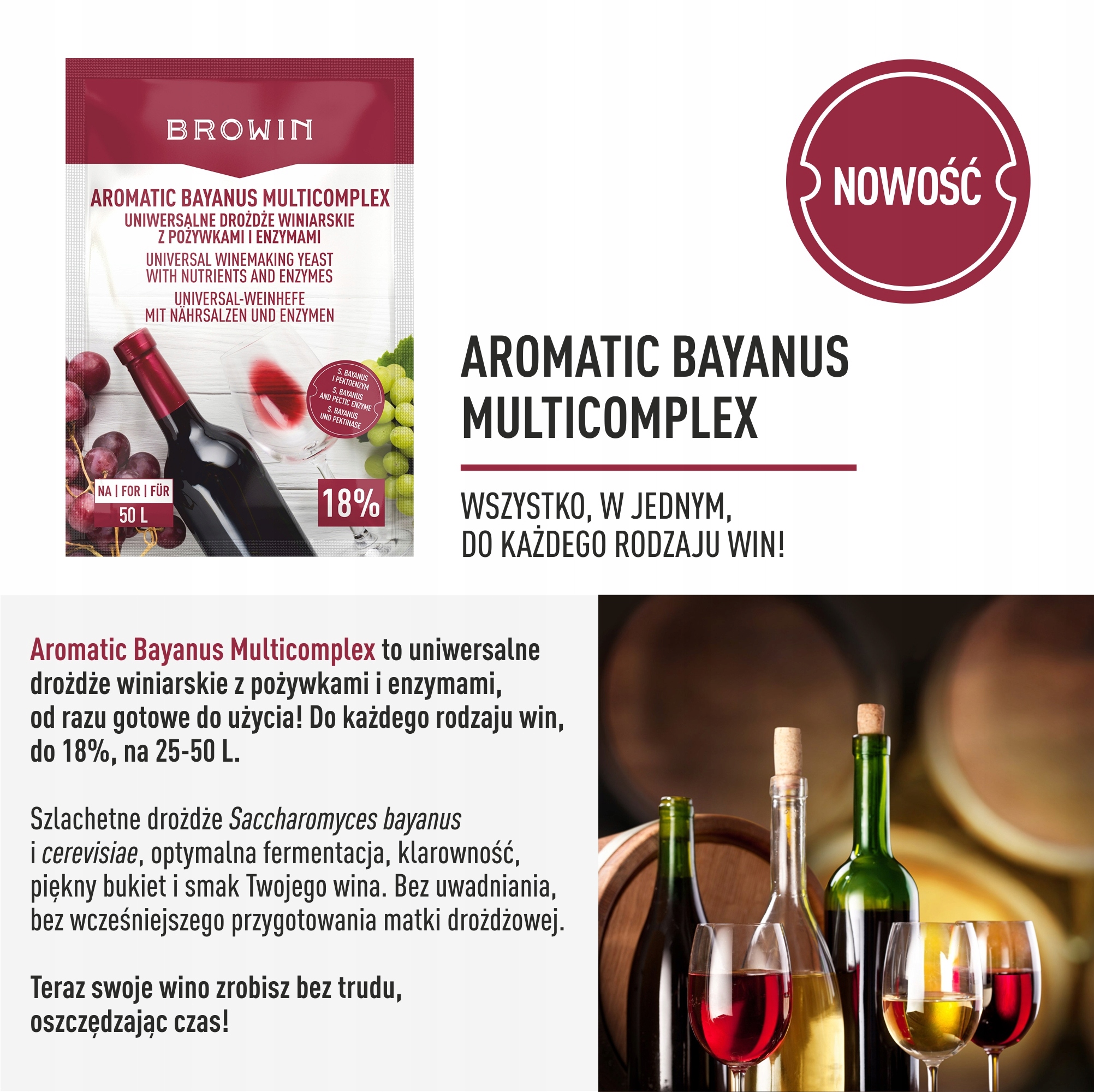 - Комплексный продукт - Ароматный Баянус Мультикомплекс — это все, что нужно для ферментации, заключенное в одну упаковку. Лучшие винные дрожжи S. bayanus и cerevisiae, питательные вещества, витамины и пектолитический фермент.