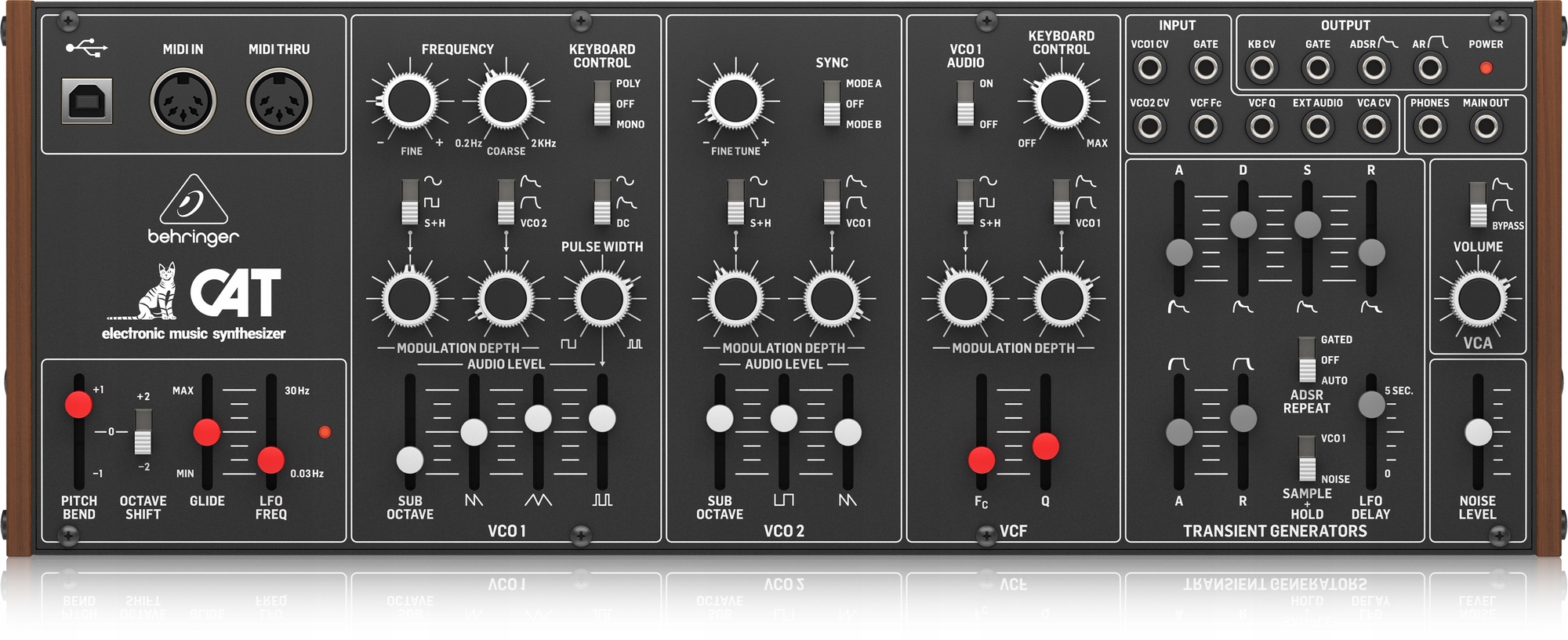 Behringer CAT — легендарный еврорековый дуофонический аналоговый синтезатор с двойным VCO, 4 одновременными формами сигналов, внешним сигнальным процессором и 16-голосной Poly-Chain