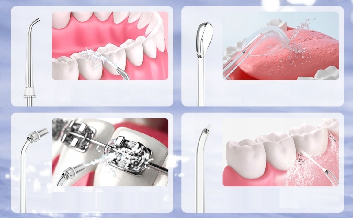 В комплект входят 5 насадок; 2 стандартные насадки, 1 для чистки языка, 1 ортопедическая насадка для верхней челюсти, 1 насадка для десен.