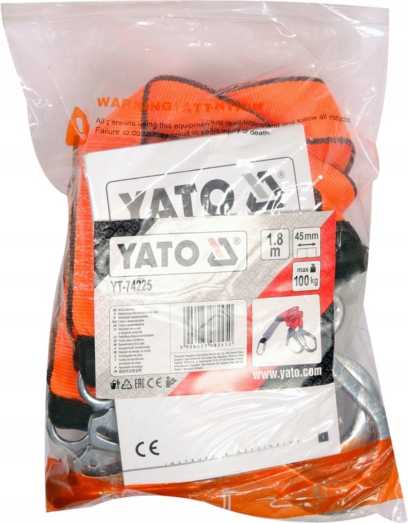 Амортизатор безопасности YT-74225с ремнем и двумя карабинами протестирован в аккредитованной ЕС лаборатории и соответствует требованиям стандарта EN 355:2002.