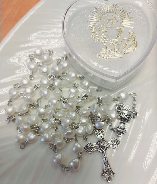 Четки Первого Причастия в форме сердца - жемчужно-белые.