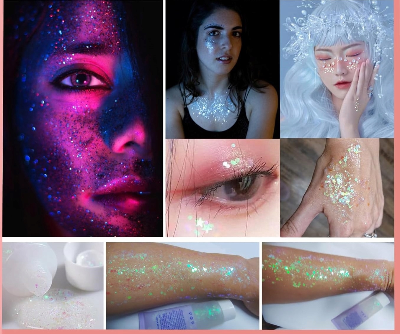 - блестки для тела и лица с гелем. Гель может быть более удобным для нанесения макияжа, и его нелегко упасть. Есть маленькие звезды, маленькие луны и шестиугольные блестки, которые очень блестящие и красивые, благодаря тому, что ваш макияж более привлекательна и привлекает внимание.