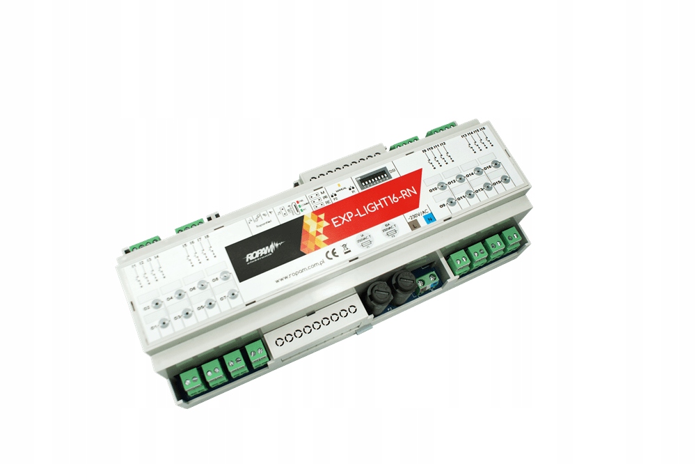 Контроллер EXP-LIGHT16-RN имеет 16 релейных выходов. Благодаря использованию качественных реле с контактами повышенной прочности можно использовать для управления любым типом освещения (питание от сети переменного тока 230 В). Например, его можно использовать для управления стандартными лампами накаливания, люминесцентными или светодиодными лампами. Контроллер также можно использовать для управления другим устройством, которое активируется при подаче напряжения переменного тока 230 В.