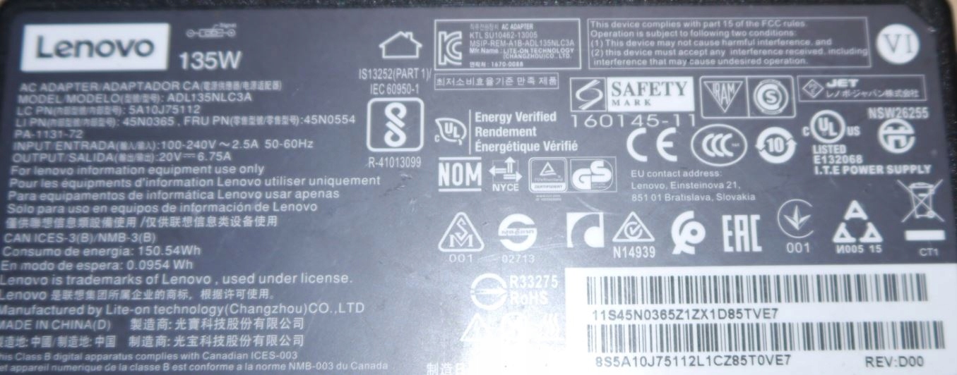 Lenovo 20V 6.75a 135W Slim Tip Adl135nlc3a slima